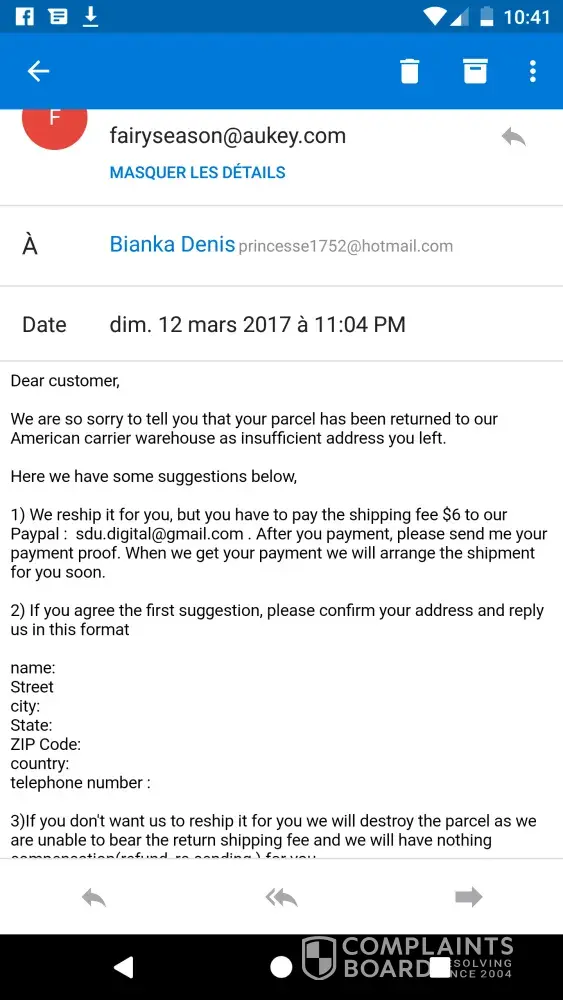 On March 12th, more than a month after my order, you told me that my package was at your warehouse and that I had to pay $ 6 more for my package.