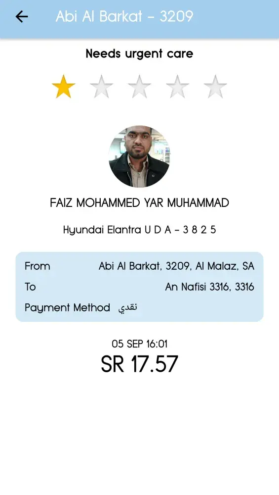 The driver Faiz mohamed (Hyundai Elantra UDA 3825) Contact #[protected] took long way to drop and was very rude throughout the trip. He was even complaining jeeny(easytaxi) for the charges. he recieved the cash sar20. He did not even checked the dropoff location and I had to walk an extra mile. When I was being polite and tried to calm him, he was being harsh at his tone. These type of rude drivers should be avoided.