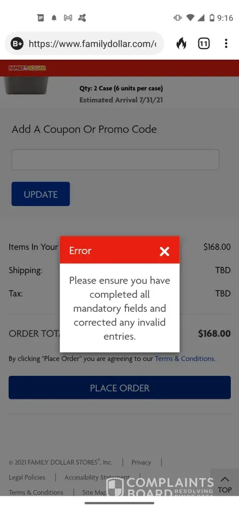 Family Dollar Online order error message cart $188.00