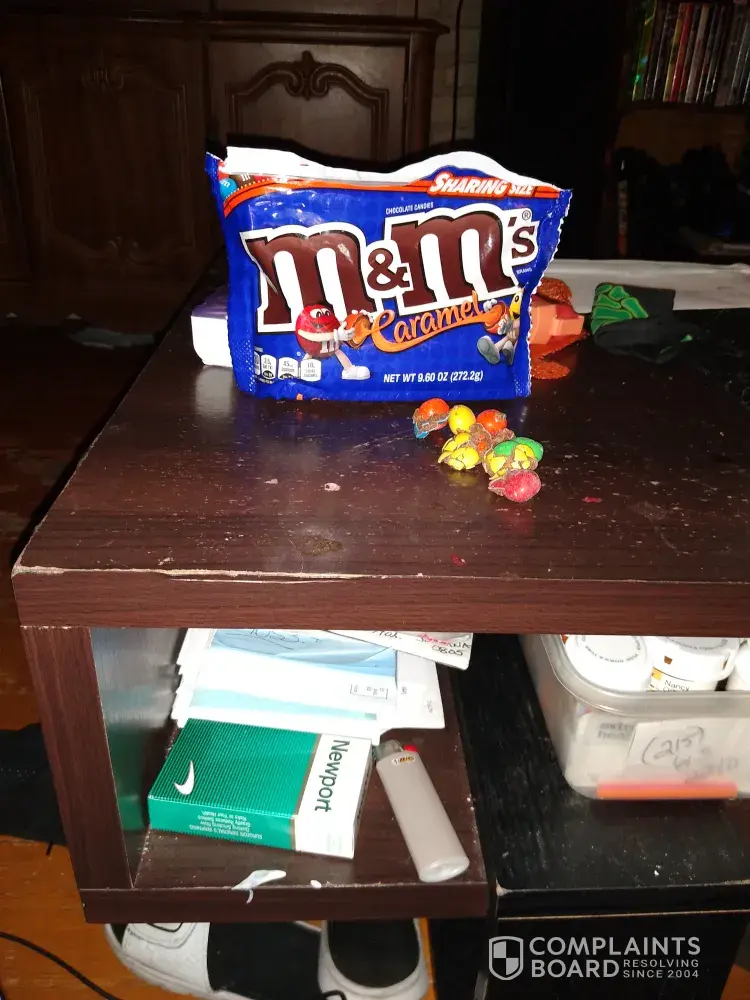 I purchased a bag of Caramel M &M's and could not believe that they were so badly crushed and broken. I buy at least 6 to 8 bags a week, I love them, I was extremely upset and you should know that it's a reflection on your company that this establishment would sell them like this. I took photos of the candy and the receipt from where I purchased them. I obviously will not eat this bag, I am definitely throwing them in the trash.