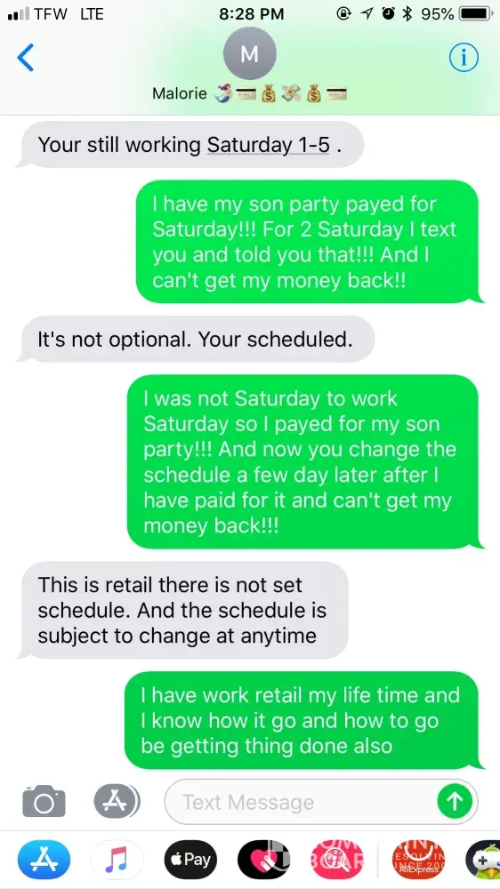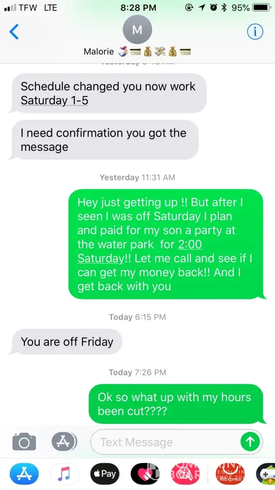 I, m complaining about my hours are been cut as a full time worker..! I should be getting about 32-36 hours a week my cashier and stocker are getting more hours then me...! Also I have got writing up about thing that I wasn't trained on and also my Store manager has been making her schedule out on Sunday! So this Sunday I got my schedule and it said I was working Friday and off Saturday..! Ok Kool I planned my son party and paying for it Monday so coming Wednesday I get a text from the store manager saying that You has to work Saturday 1-5 I text her back and let her know I had already planned and play for my son party..! And can't get my money back! She then text me and told me I was off Friday and has to work Saturday! But my money supposed to just go down the drain...! My ID # is 6264550 all so I don't think it's ok to have her kids to come in to work and stock in the store! Y'all can contact me at [protected]!