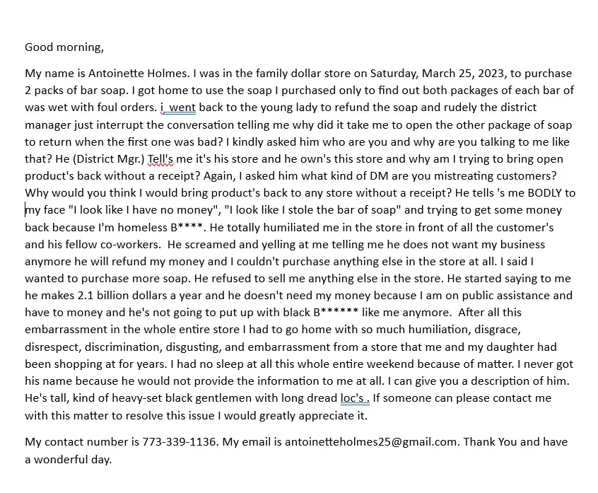 I was in the family dollar store on Saturday, March 25, 2023, to purchase 2 packs of bar soap. I have never been so humiliated and embarrassed in my years of shopping in any store. I will never shop here again.please see my attachment for the full story. I would like somebody to contact me back at [protected]. again please see ATTACHED.