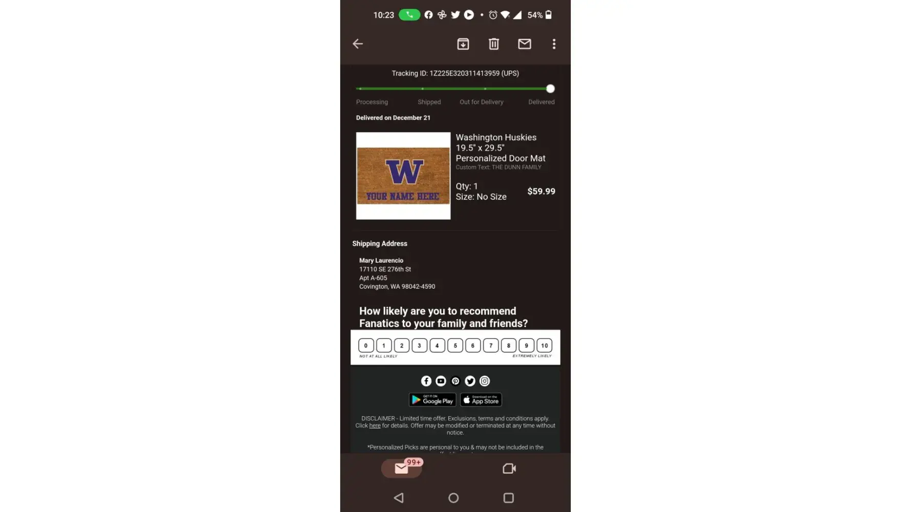 I had ordered around Thanksgiving 2 welcome mats that were from Fanatics and they were for The Washington Huskies & I received 1 & it was nothing like the picture, so they replaced it & I still hadn't received the 2nd one. So around the end of January or February I got them and Xmas had passed,and each family returned home, so I saved them for when they came back to town, which was Easter & I gave them to take back home and to my surprise, they both did not even compare to the picture & I already gotten the "The Dunn Family" my daughter & family a replacement & it was just exactly as the one I complained about and my parents "The Fehrs" also didn't look good, the letters are faded and I'm so disappointed because one they cost me $135 for the both of them and also was thinner & the material they make these with Coconut bark I believe, is falling out of the mats. In all honesty I wouldn't pay $20 a piece and the importance of these mats is my Grandson plays football with the Washington Huskies. So it meant alot to give these to my Families & truly I feel just awful about it, I'm a proud Grandma and these Mats were so special for when they entered there homes, because it's the 1st thing you see when you walk into the house and I was so excited for them to get at Xmas but Family had to return home & couldn't wait to get them, besides when I called about the 1st one & told them to check & make sure my parents didn't look like my daughter's washed out and they hadn't even sent it yet, in fact it hadn't even been ordered & I had to go through that. Every step of the way was horrible.