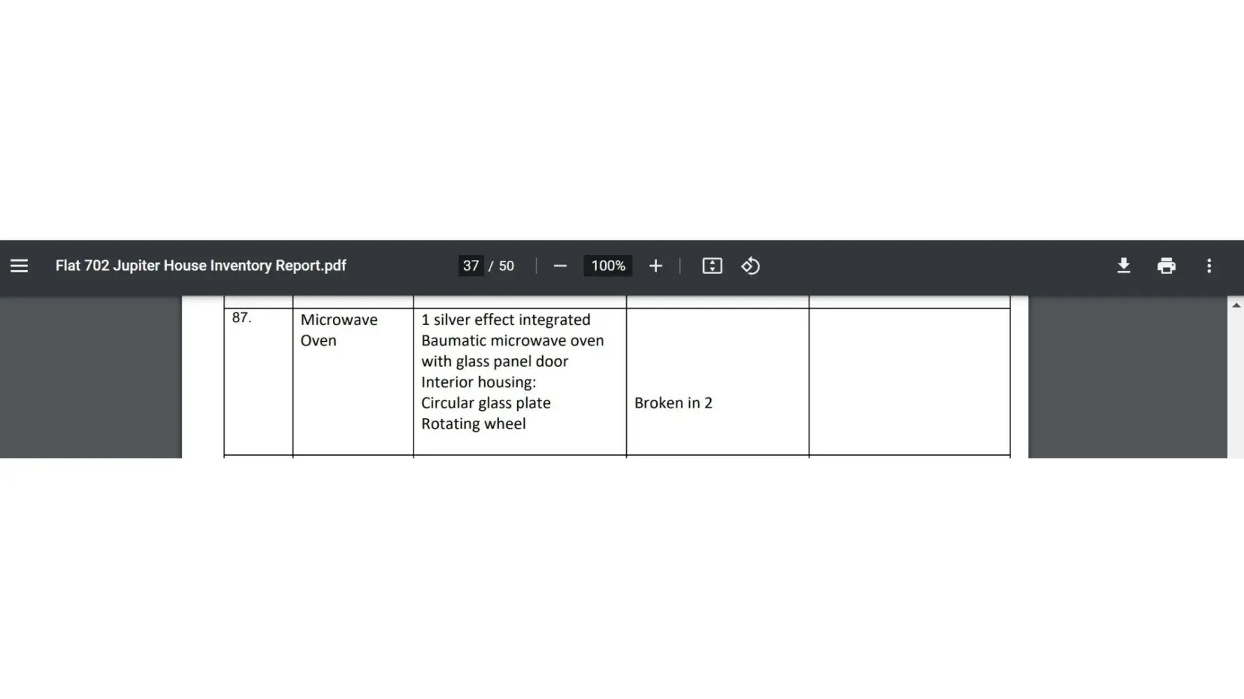 as I was leaving Uk on 16th Nov, so have the inventory report carried out the next day, and when I received the report a few days ago, found out the microwave glass turnabout is broken into 2.