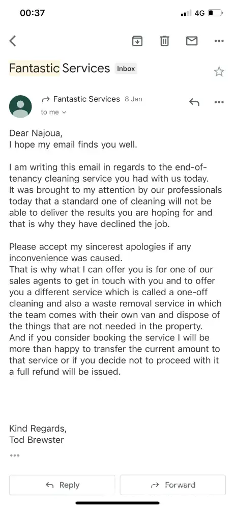 I have to hand back the keys on Monday and I only found out at 5pm that the cleaning was not done for my end of tenancy cleaning. How professional and caring about the customers is fantastic services? I am now left without cleaning and I couldn't find anyone else to do it in a such short notice.