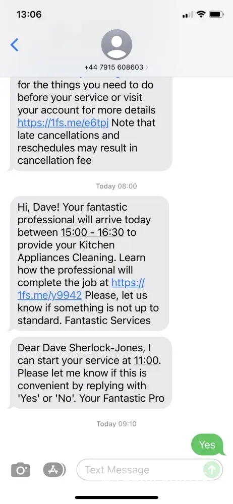 I originally booked cleaning of the above for 3pm today, weds 26th Jan, I was called and asked if the room cleaner could start at 1pm instead, I agreed, even though this meant I now had to sit in all afternoon. When I woke this morning there was a text message from a 'Fantastic Pro' asking if it was ok that they came at 11am, again I said yes.