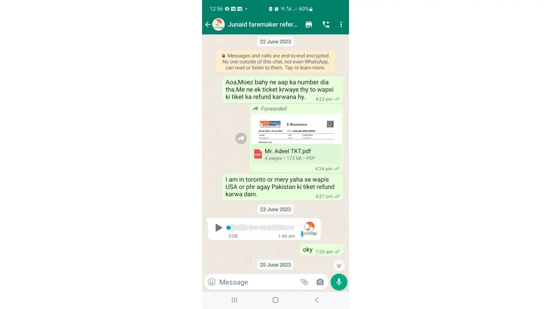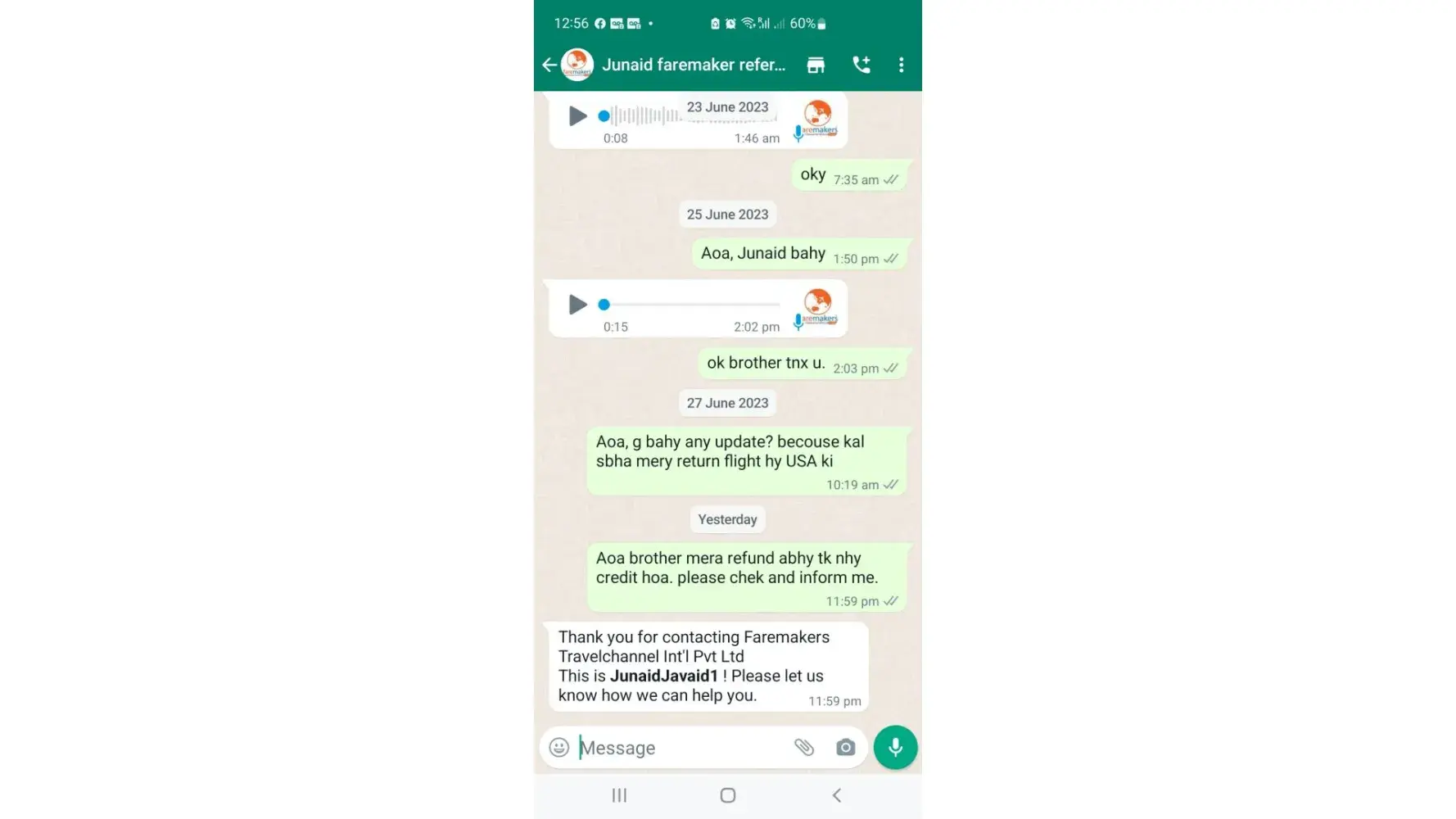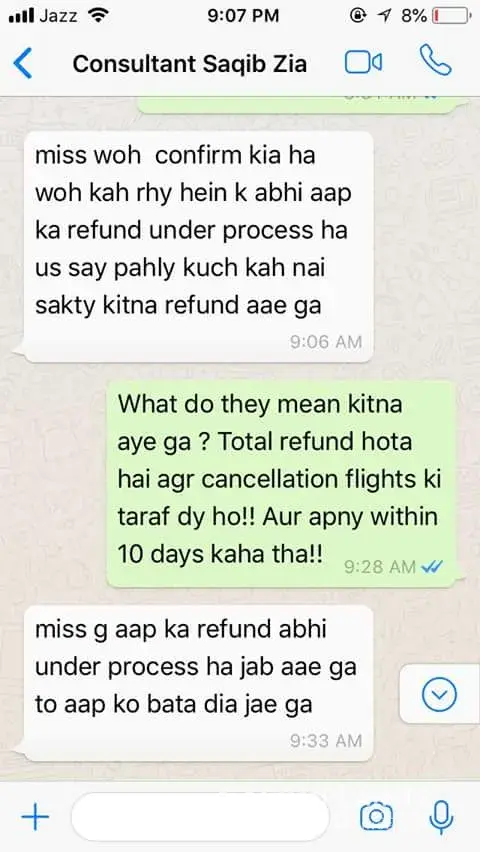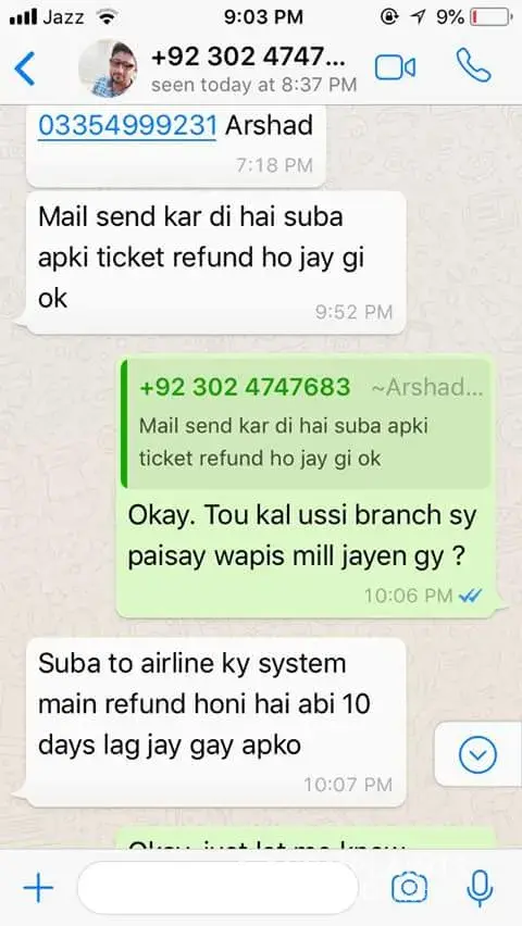 Today dated 12 Agust 2023 I again contact Mr Junaid and he said that I did not ask you like this. And I have no refund of your tiket.