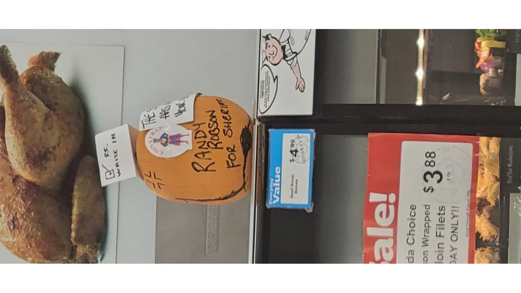 In currently visiting our local Fareway I and others have seen at the meat counter something posted that is so disgusting and tasteless. The fact that even your local management of this store allows this to be displayed is just as appalling. Your meat department manager has found it funny to mock a candidate that is currently running for sheriff in thi...