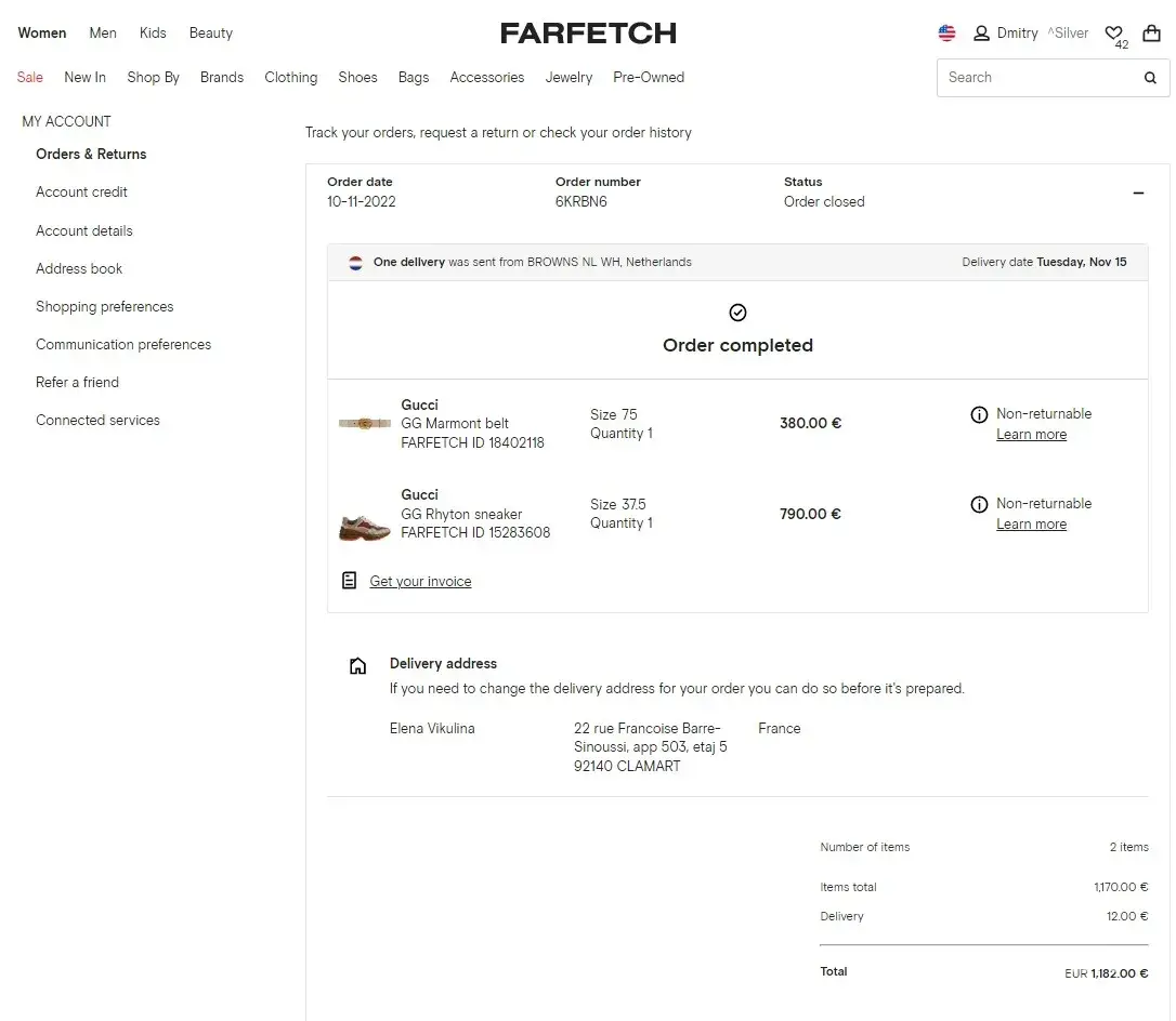 I have paid for goods at Farfetch (see document 1 - comm invoice and 1. Order) with delivery address in France (where my family lives) to Elena Vikulina's name.