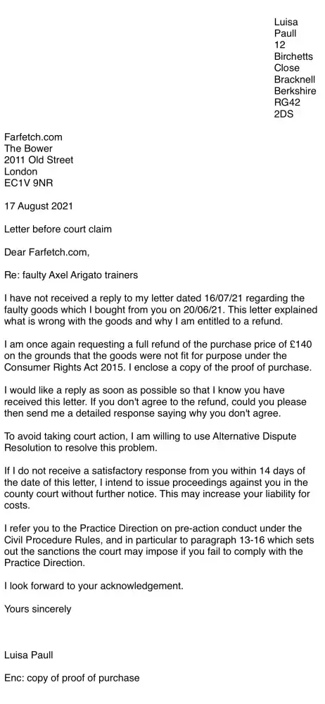 I bought my daughter some trainers from Farfetch for £140, they lasted a month and the rubber on the bottom is coming away on both trainers. I emailed them and they offered to repair, took them to the repair shop and he said gluing would not work. They have offered me 10% of my purchase price which is not acceptable, I have asked for a full refund or replacement, but they say no. I have sent them a complaint letter to which 16days later still no reply.