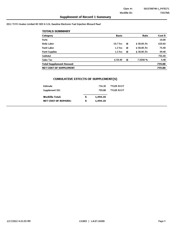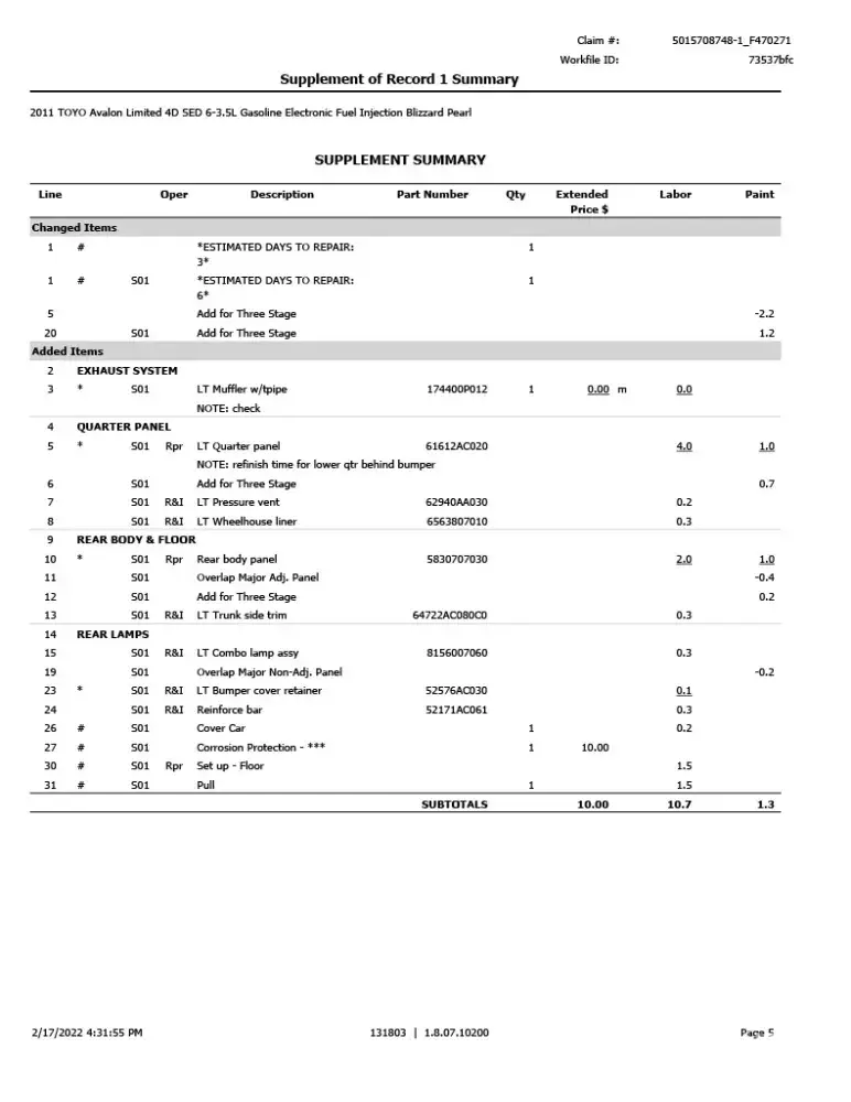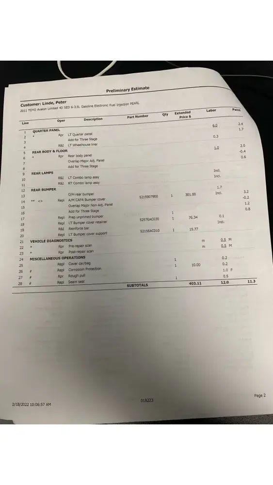 As I will most likely be repairing the car myself, I want an accurate estimation of the damage done for the cash settlement. Estimates from Farmers and the Body shop are attached.
