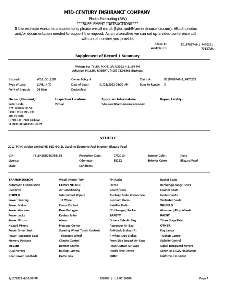 I was surprised the difference between the two estimates was so large. The problem is that the estimate from Farmers was conducted virtually, and isn't accurate (Example 1, Page 3 line 3 of the Farmers estimate has a note to check the muffler for damage, Example 2, no frame labor in estimate to straighten the cars frame). I brought this up but they aren't willing to change their estimate. Farmer's said they are also not willing to have an in person adjuster look at the car either. Farmer's told me my options are: