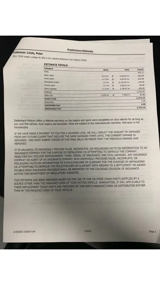 A couple weeks ago, someone hit my parked car. I got their insurance and started a claim. I would prefer to get a cash payment for the damage done. I filed a claim through their insurance and got an estimate from the body shop (Dellenbach Motors). The Insurance company said I had to do a virtual estimate through their app, so I did that as well and they provided an estimate.