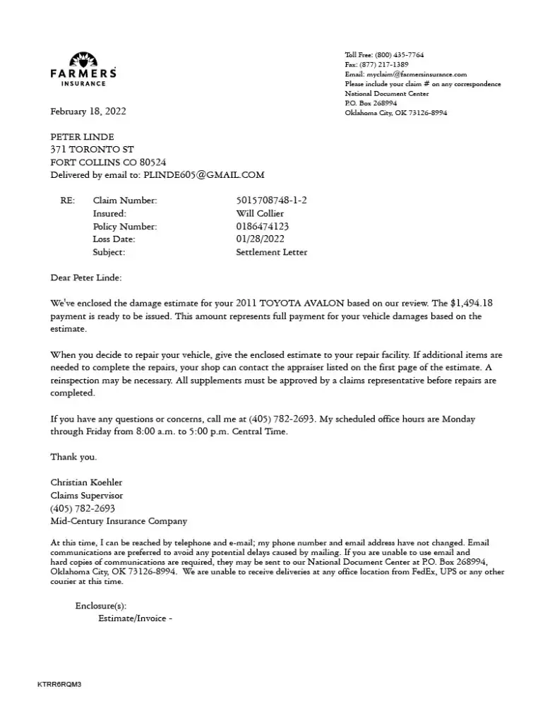 Desired outcome: A cash settlement for the actual amount of damage that was done to my car, not the Farmers virtual estimate amount which does not include all damage.