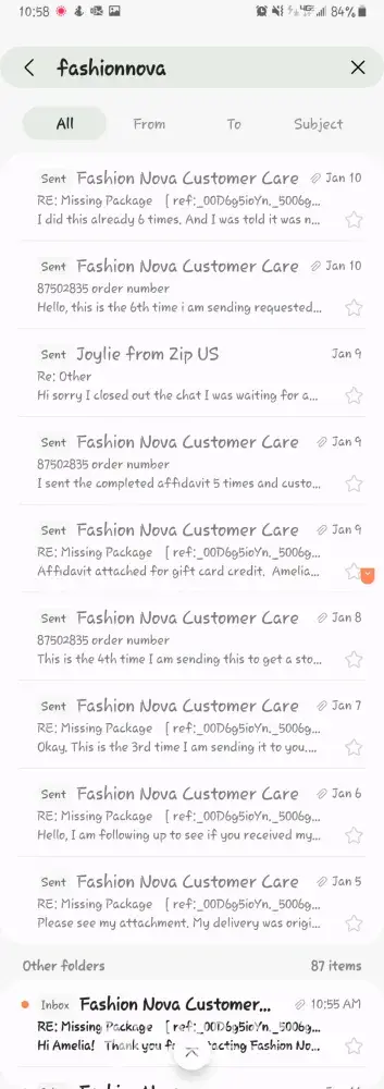 My order #[protected] says it was delivered on 1/10/2022, it has been 8 days but I still haven't received it. I contacted customer support on fashion nova website's help center, but haven't received any response. I also tried calling their 1-800 number, but there was not a live person answering. I also emailed them and received an automated reply telling me to contact them via their website's help center which I already did. I don't know what else to do. If they don't respond to my request or help solve this issue, I may have to contact my credit card comp to intervene.