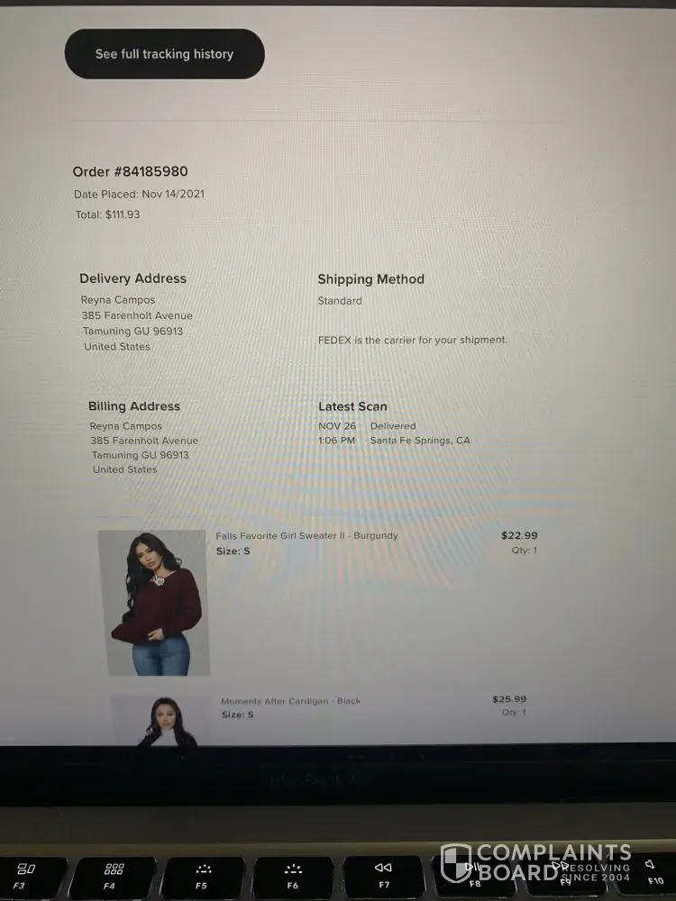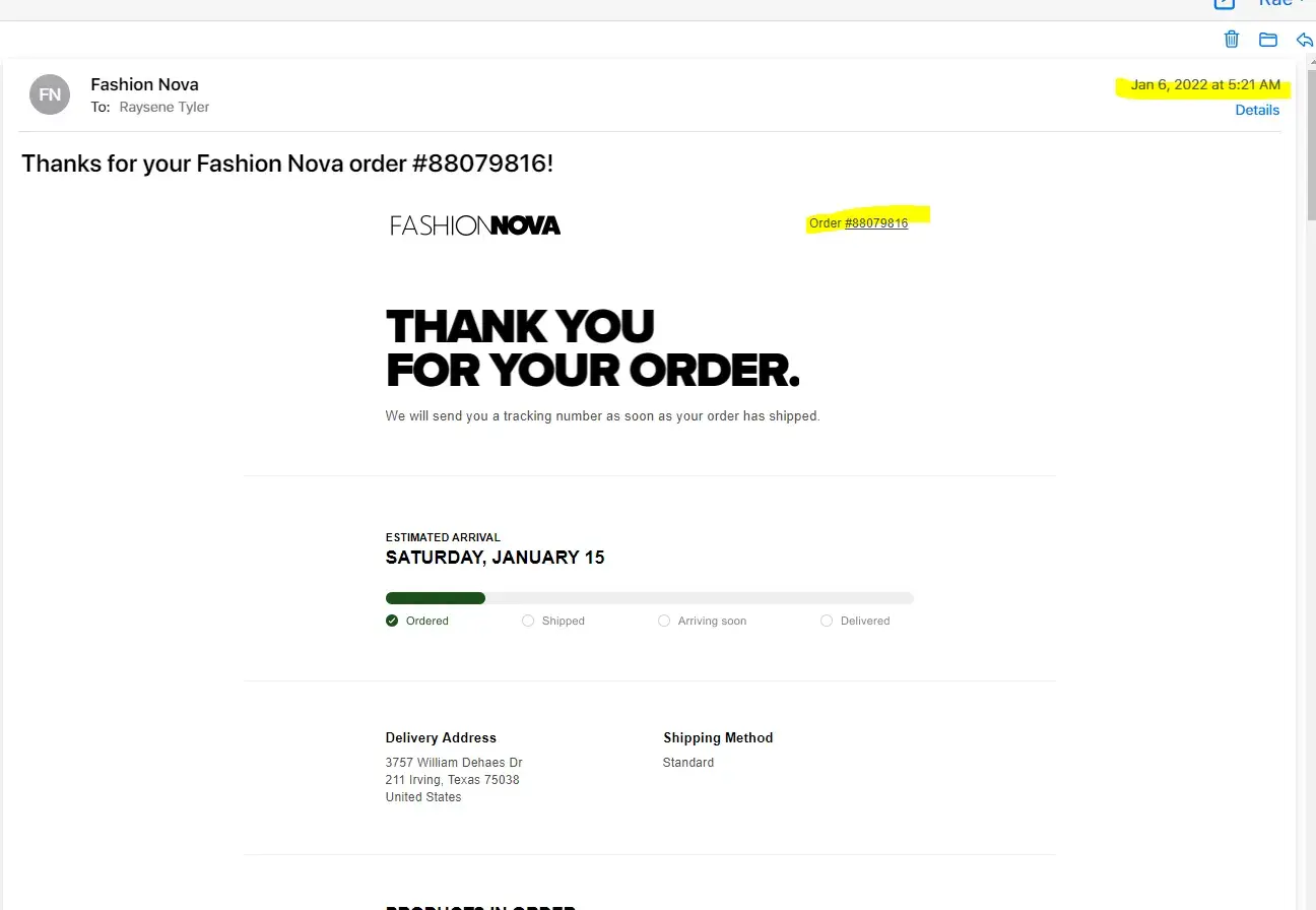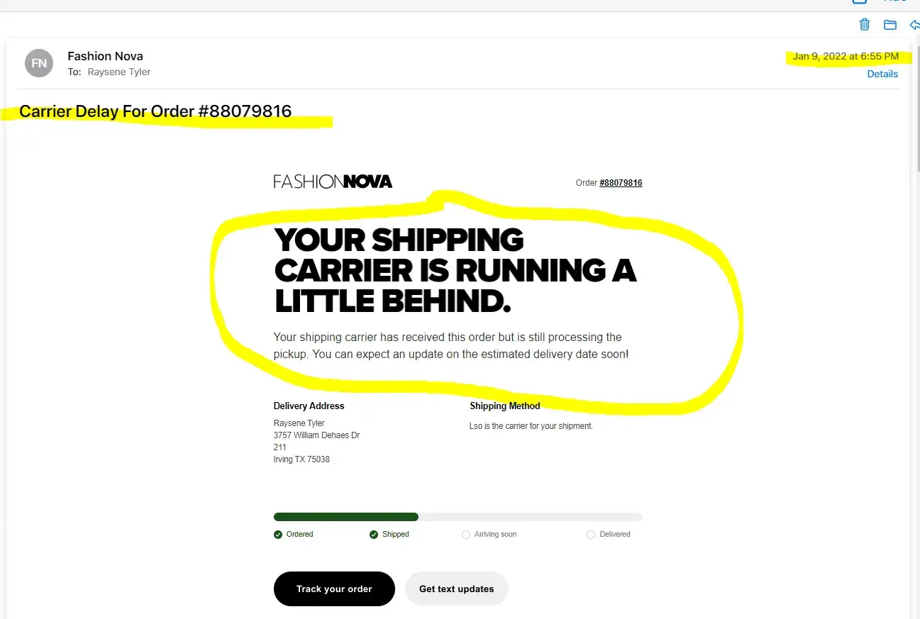 I spent $144.94 dollars on Fashion Nova I have never had an issue until recently. I put an order in Jan 6th 2022 received an email with an estimated date of Jan 15th 2022. I received an email Jan 9th 2022 advising that my order will be delayed, however I received another email on Jan 12th 2022 saying that my package was delivered to the Front Door. Nothing was at my door. I go to Fashion Nova website to Track my order but I can't call anyone I can't email anyone. The website says to file a complaint within 10 days yet how can I when I have no way of reaching out to Fashion Nova. You can't tell me a Live Person does not work for Fashion Nova.