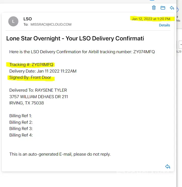 I placed an order with Fahion Nova on 1/7/22. Shipment tracking reported that my package would be delivered on Thursday 1/13/22. On 1/13/22, the shipping notice updated and reported that my package was delivered on Tuesday 1/11/22 at 8pm. The package was never delivered on 1/11/22. There was someone at my home during that time and I arrived home shortly before 9pm; at which time no package was on my door step. I contacted Fashion Nova and Lasership to report the incident. Lasership reported that the package was delivered on 1/11/22, but not picture was taken of the package at the front door. Lasership reported that I would have to speak with Fashion Nove regarding the incident. I contacted Fashion Nova on two occasions now with no response. There's no way to speak to anyone in customer service and no one replies to my claim.
