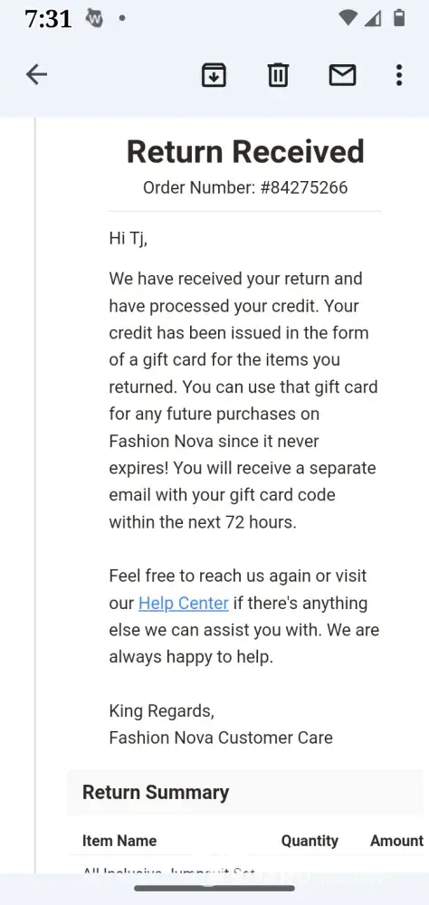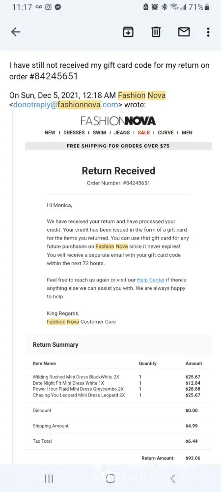 I sent back a return of items totaling $93.06 and still have yet to receive a gift card code for my return days after they emailed me saying I would receive it in 72hrs. I've reached out to them TWICE and still no reply. This is not the first nor the second encounter I've had dealing with Fashion Nova's lack of acknowledging their lack of communication with unsatisfied customers. At this point I may just start shopping with another brand. Fashion Nova has HORRIBLE custom service!