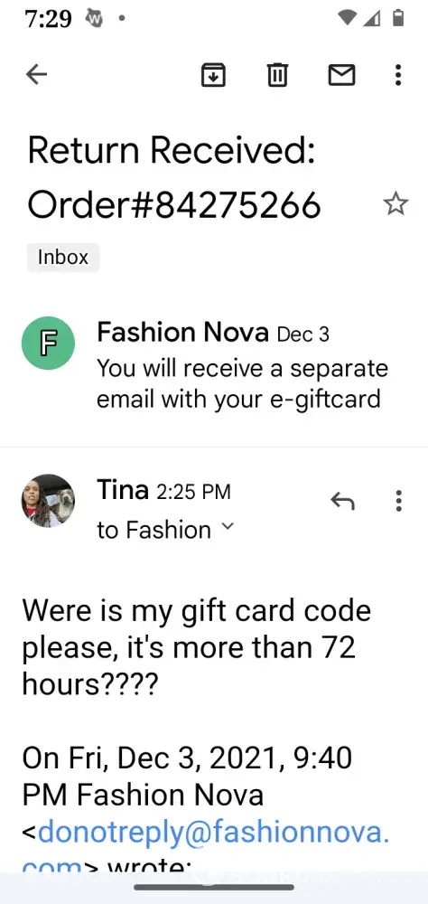 I returned my order received a return received confirmation email stating they would send a eGift card within 72 hours but it never came. I started posting what happened on fashion Nova's page on Facebook and the BBB then I received a email stating the eGift card was ready I used the eGift card last night. This morning I go on my account, no order!
