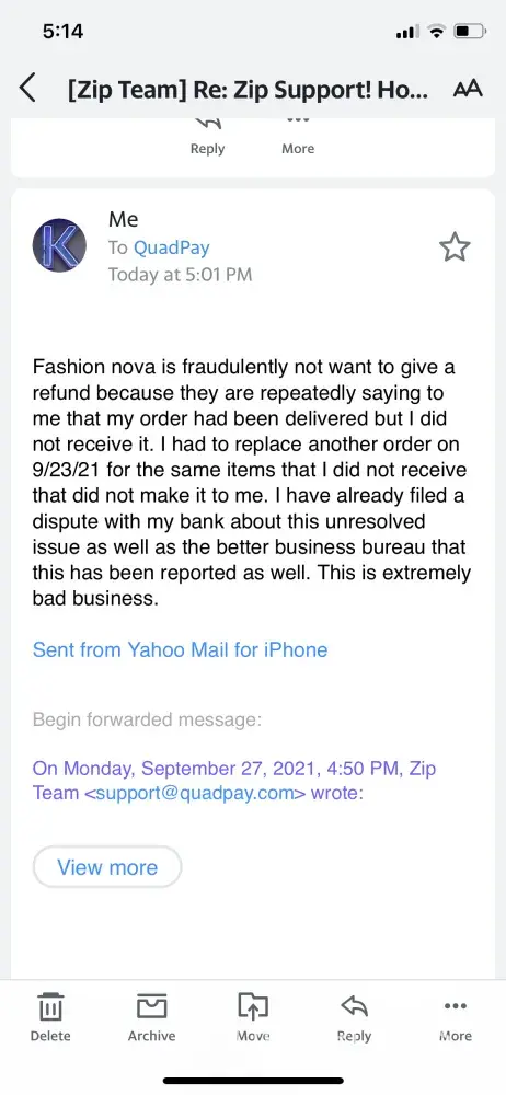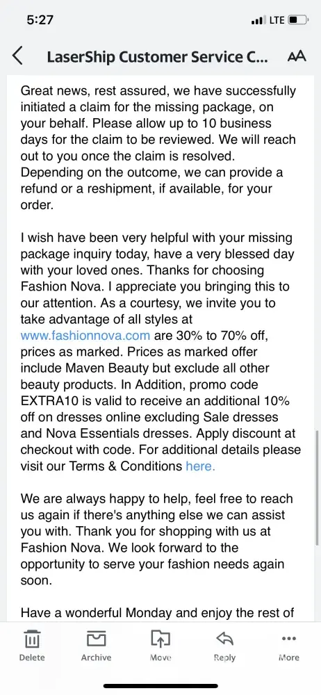 I placed an order through Fashion Nova in 9/10/21. On 9/23/21 I received an email from Fashion Nova that my order was delivered and I did not receive it. I contacted shipping carrier laser ship for them to investigate where my package was. I had not heard back in a couple of days. I called and spoke with a customer service representative named Kings that I advised me that my package could not be found. She emailed me proof and I sent the proof to [protected]@fashionnova.com and they advised me that there is nothing they can do to either refund me my money back, provide me a store credit, or simply reship my order. They did not want to assist me. I needed the items so much that I replaced the same order on 9/23/21, the day that my 9/10/21 order was supposedly delivered to me on 9/23/21. My apartment leasing office manager dud not retrieve my package from the leasing office, mon of my neighbors, or even the msil man did not have my package. I placed my order through Quadpay and fashion nova and Quadpay could mig refund me my money because fashion nova would not refund them their money from me arranging a payment plan through another pay source gFashion Nova uses called Quadpay. I need a resolution regarding please assist. This is all I ask.
