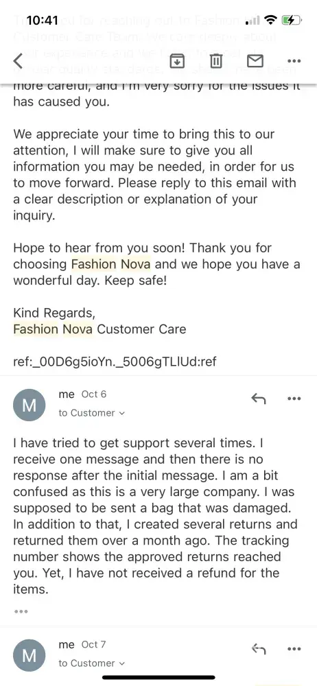 I ordered from this merchant fashion nova on 10/7/21 paid for express shipping. It was supposed to be delivered on 10/11/21. I have not received an email confirmation or my items. I'm very dissatisfied as I'm going out of town and do not have my swimsuits for my trip! Smh I can't even get a refund from them because nobody is responding from customer service.