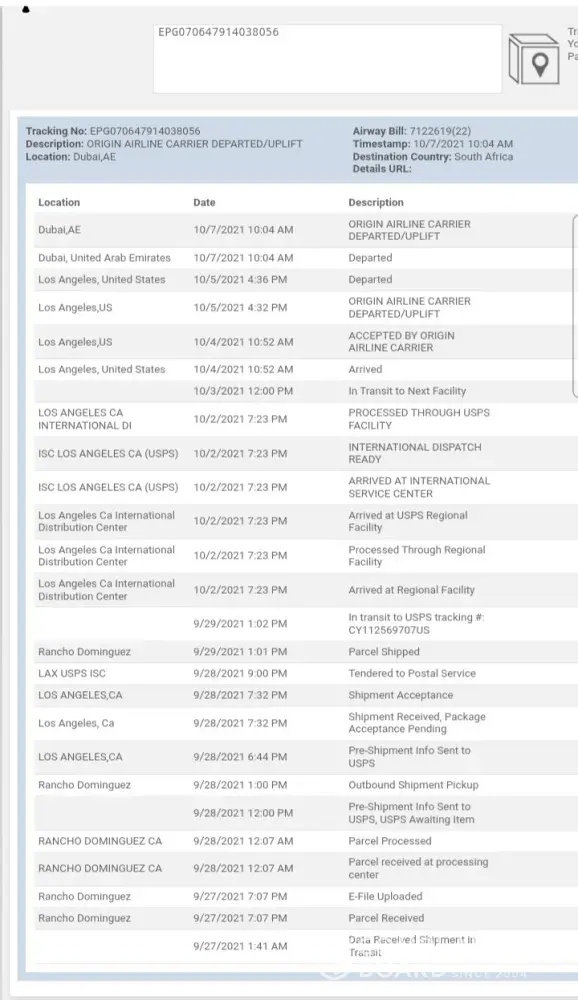 The last time there was movement in the Shipment was in Dubai on 7 October 2021. Now you can't tell me it takes a whole week to ship from Dubai to South Africa, what transit is used does the courier company use here ? Is it Tortoises perhaps once the delivery gets to Africa, I'm really amazed at this point.