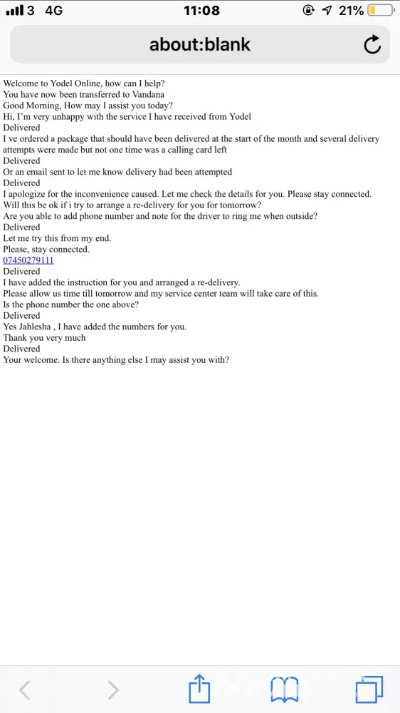 Whilst pointing out all the errors Yodel had made, the adviser "Shelton" attempt to dispute the delivery drivers could not access my building, which is why they did not leave a calling card. I then went on to state my postbox is outside, right next to the door and proceeded to take a picture and sent it to Shelton. But rather than attempt to rectify the situation Shelton abruptly ended the chat, which led me to go to the depot the next day, I spoke to the manager who told me had the issue been rectified the day before by Shelton, my parcel would not have been in transit back to the sender.