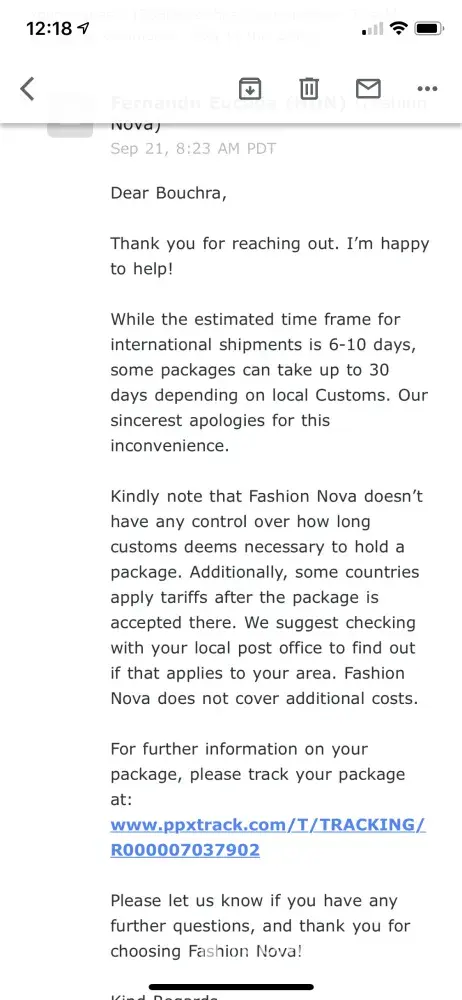 my delivery is late and when I contacted fashionnova they replied with a generic message