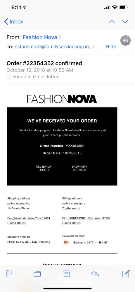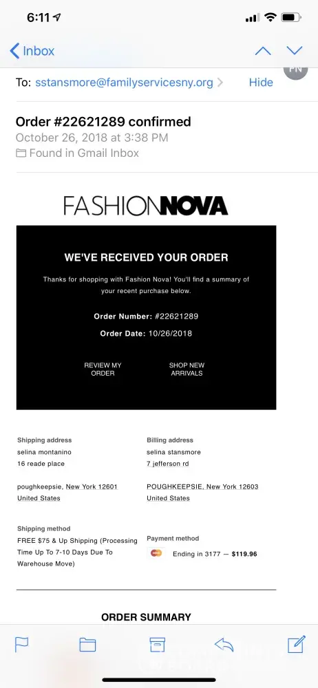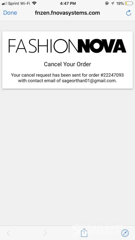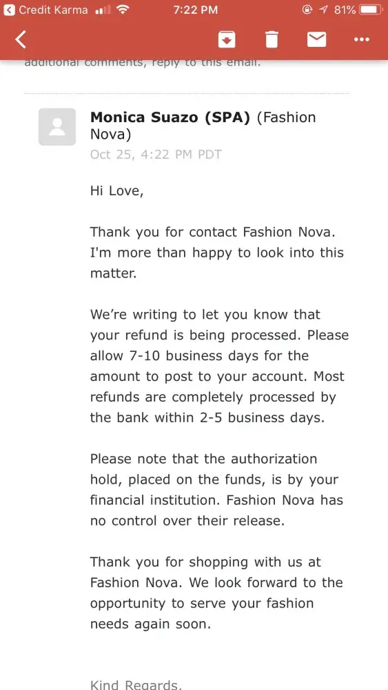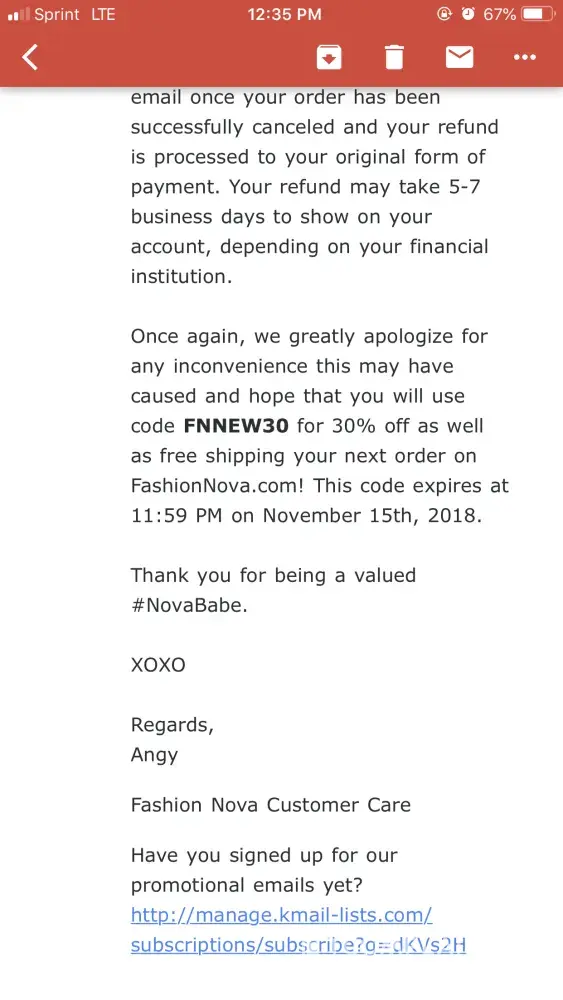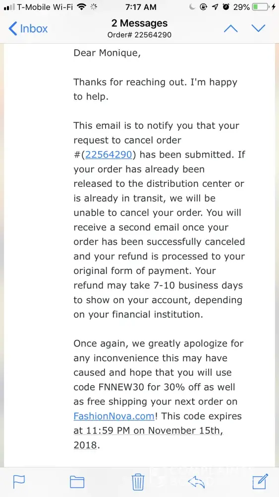 I then reached out to FN support to confirm cancellation and received email confirmation on October 29 from Kevin C. (I would write his last name but it's not fair that an entry level rep gets called out by full name when it's really just Fashion Nova being a [censored] show of a company).