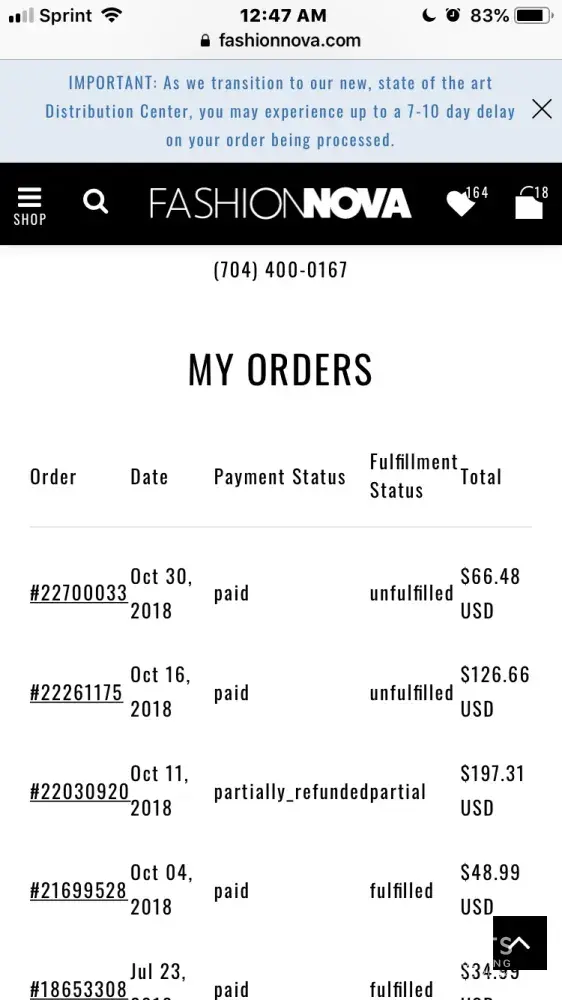 I placed a $200 order on 10/18 and it is not 10/30/2018 and I still have not received my order. Every time I email fashion nova customer service I do not receive any helpful information in return. Your phone customer service sucks, today the least. No live body ever came to the phone after 45 minutes and the call ended on its own- still with no answers. I did get an email saying there was a delay at the warehouse but that was over a week ago and I still have received no information or package. I am livid at this point, I spent a few hundred dollars on your website and get nothing? I cant even get answers about my order. The order number will not let me track my order on your website. I have tried EVERYTHING to get ahold of someone. The money has been deducted from my account with no products to show for it. I am very disappointed, although I love your clothes I do not think I will be able to place anymore future orders from fashion nova unfortunately.