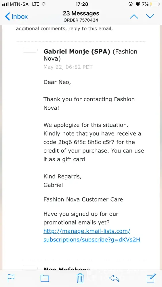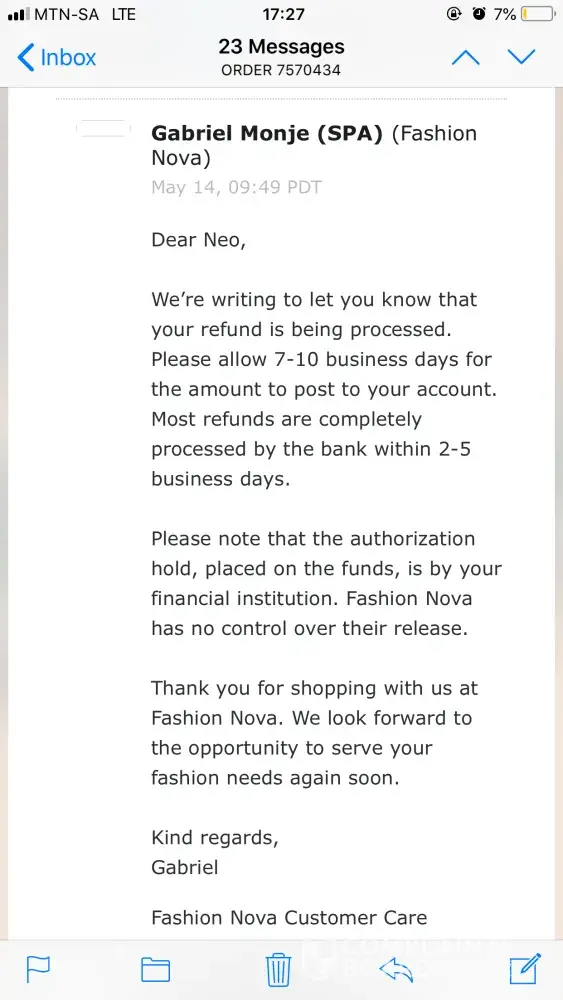 I NEVER received my order. The order number is 7570434, it was meant to be shipped to South Africa. I have checked with the courier which you indicated would be shipping my order and they insist that the package had left for South Africa on 11 September 2017. I've also tried to check with my local post office for the package and there is no package there. I in addition checked the tracking number given and found out that the package was in LA in March 2018 & yet no one from FashionNova bothered to contact me & inform me of this. After various emails sent to [protected]@fashionnova.com an Eylin Rodriguez responded on 26 April 2018 stating that a refund would be sent to my account within 5-10 working days. I waited for that period and there was still no money in my account, I then sent ANOTHER email to the same [protected]@fashionnova.com indicating that my money STILL hadn't been reimbursed as promised, then a Gabriel Monja responded on 14 May stating that my refund is being processed. But the most bizarre thing is I still don't have my reimbursement, instead the very same Gabriel Monja has sent an email on 21 May 2018 saying that my query has been changed to get store credit. I DONT WANT ANY STORE CREDIT FROM FASHIONNIVA BECAUSE OF THE DISHONESTY DISPLAYED BY THE STORE, I DONT WANT TO SPEND MY HARD EARNED MONEY ON A DISHONEST COMPANY THAT OBVIOUSLY LOOKS TO SCAMMING PEOPLE OUT OF THEIR MONEY. I SIMPLY WANT MY MONEY AND TO CUT ALL TIES WITH THESE PEOPLE!