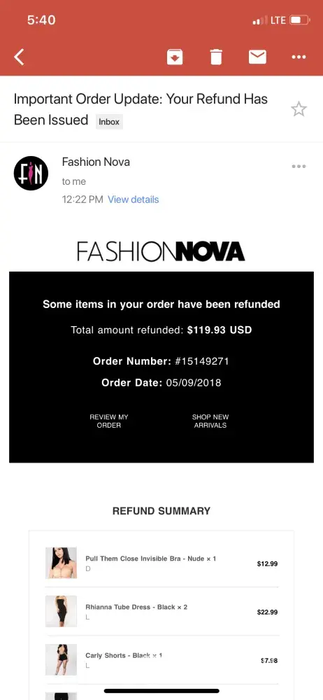 I ordered clothes from fashion nova on 3rd may 2018. After 5 days i got a mail from them saying that my order has been refunded. It has been 4 days since then and i am still waiting to get my money back . They issue e-gift cards as refund. Im fine with that too. The amount which i spent was 119.93 USD. I emailed them 3 times, and just got one machine automated response saying i will her from them soon. They have not replied since then. Pls help