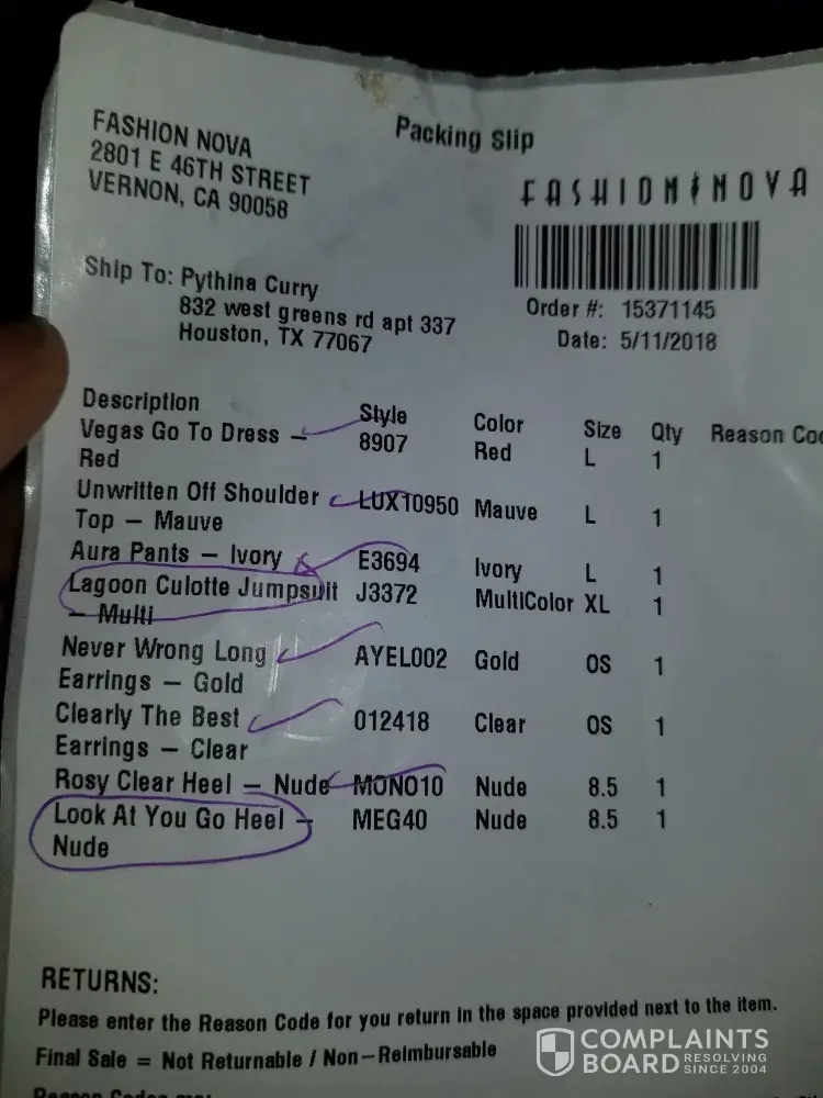BEWARE! I ordered over $100USD worth of products at the beginning of May and Fashion Nova sent me the completely wrong order. On the packaging, they had my address with someone else's name. On the packing slip, they had the same incorrect addresses name and address, so clearly they do not do final checks when preparing and sending out orders. I am going on vacation as well as celebrating a birthday at the end of the month and when they finally responded, they said that I had to return the items and they will send me an e-credit. I advised many times that I do not want a credit, I simply want my original order sent to me asap. I have yet to hear from them and I think its really sad that they do all of this promotion on social media especially with celebrities then turn around and have HORRIBLE customer service. This will be the last time I order from them.