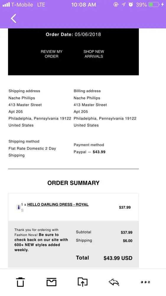 I made a order on may the 8th 2018, I just recieve it may 15th. I only recieve two of my items im missing 6 items, they send me a black bodysuit that I did not order them it had a big hole in it. I have spent alot of money with fashion nova and for them to pull some [censored] like this its [censored]ed up. I have been calling no one never answers, I have send so many emails no one never replies. I need my [censored]ing money are my items that I'm missing! How the [censored] y'all try to get over someone!