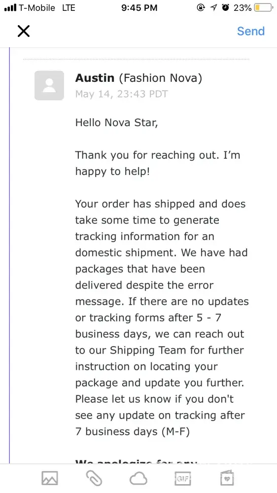 I order a dress for prom from fashion nova on May 6, 2018, I paided $6 for the domestic today shipping meaning it will be coming fast as possible... I've been contacting the Nova team by email 24/7 about my dress not having tracking updates... so finally on the 14th a team member emailed me back saying it take 5-7 day but remind you I've made the order on the 6th meaning it was supposed to been here by now so I contacted them again & they said UPS loss my package so it took them a long time for them to realize my package was lost so now I have no prom dress