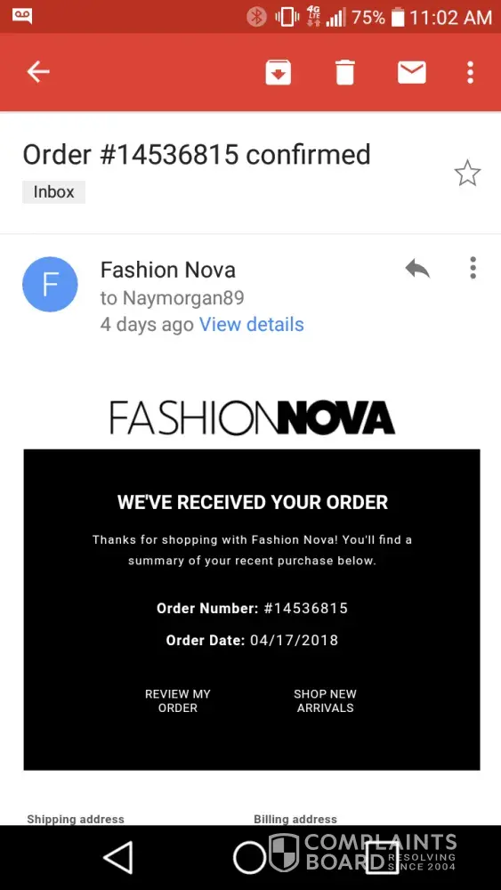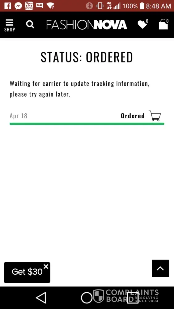 I purchased a dress from Fashion Nova for the very first time on the 17th of April with the 2 day shipping got a confirmation email for my purchase checked my tracking info through the email and it says ordered checked my tracking through their website its says no tracking info available here it is today the 21st and no item delivered yet sent an email now waiting for them to get back to me