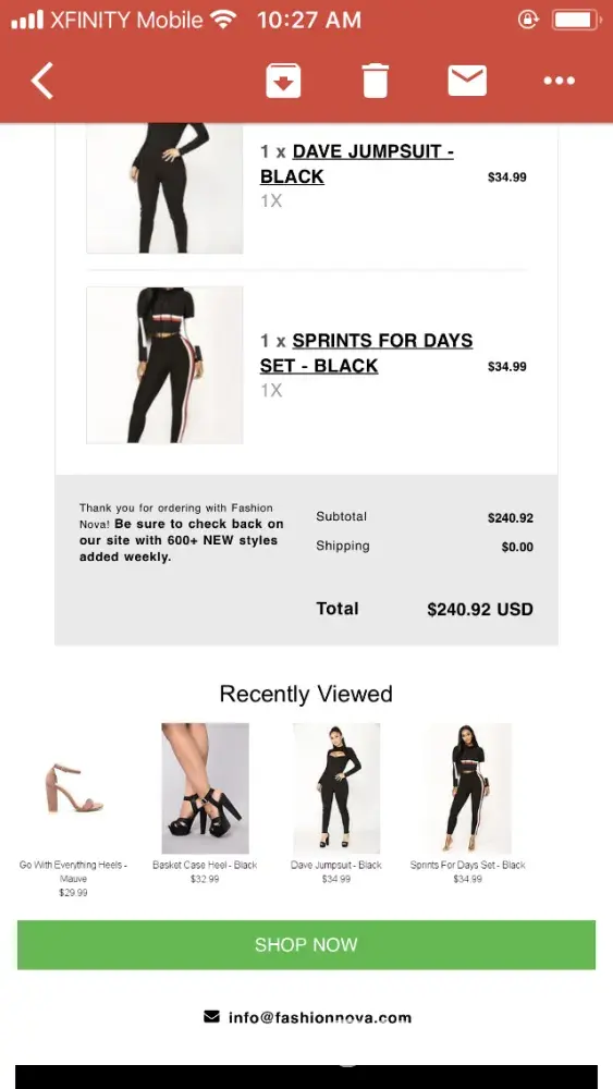 Fashion Nova did not honor next day shipping after accepting payment for it. I should not have to wait 1-2 business days for correspondence about product that I payed to have next day. All the reviews are absolutely correct and the false advertising is unfair to customers. They have given no no further information about my order status or if I will receive a refund