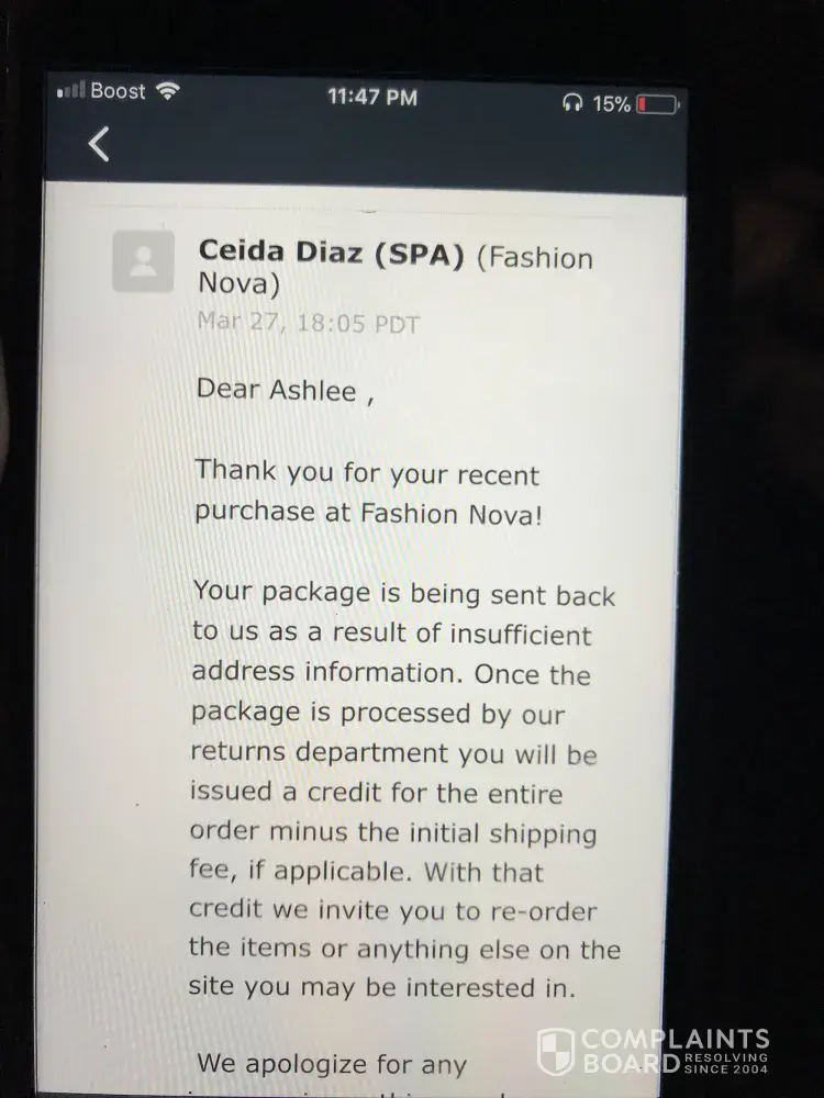 On March 19th 2018 I Purchased a order for $214.11 order number #[protected] tracking number #9405510205369032711676 and I NEVER recieved it for 3 days it stayed in the same one place in Los Angeles so after 2 times of emailing them 3 days later they messaged me back and said my order has been shipped back to them and that I will be credited but after 2 days I emailed them again and they Never replied back it is now April 3rd 2018 and I still haven't heard from them and I messaged them 3 times since then .i ordered from them multiple times this was my biggest order that I ever did and that was first time I ever experienced this with fashionNova I even tried to call the number that I searched for registered for them and I still didn't get no where with that number .My name is Ashley Bobo my email is [protected]@yahoo.com and phone number [protected]