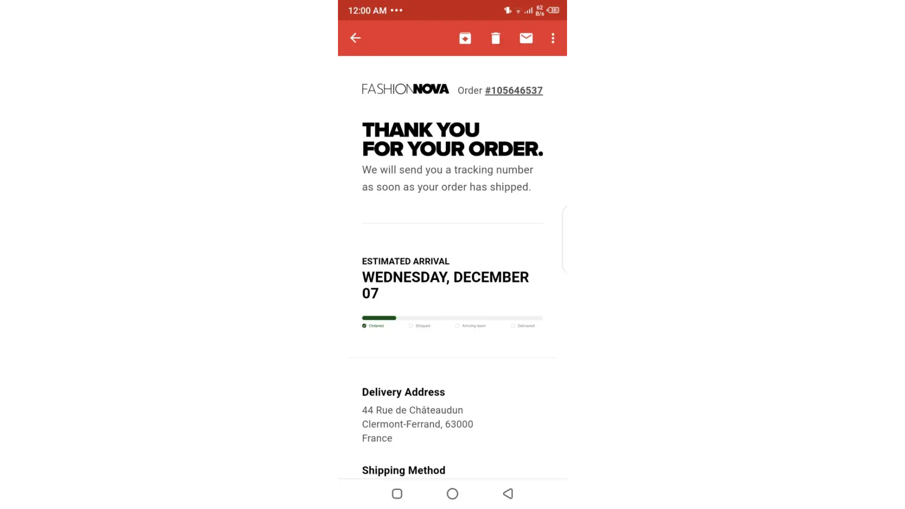 I ordered from fashionnova on 26 november and it was written that my order will arrive on 7 december but few days after ordering they changed the estimation of delivery to 19 december. The problem is that I live in france because I came here to study and on 18 december I will go back to Morocco to spend Christmas with them and I won't get back to france until 30 december.