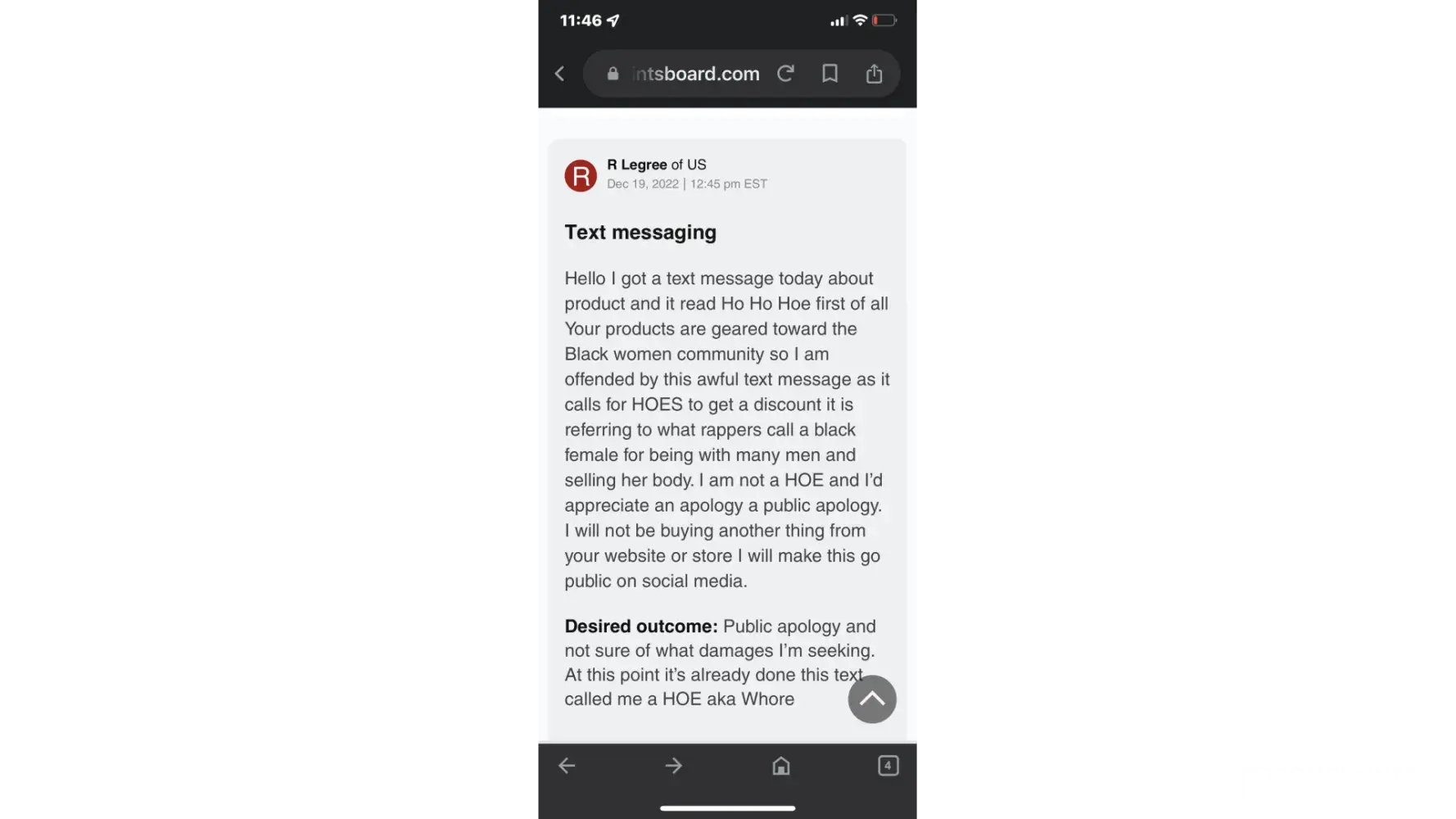 Desired outcome: Public apology and not sure of what damages I’m seeking. At this point it’s already done this text called me a HOE aka [censored]