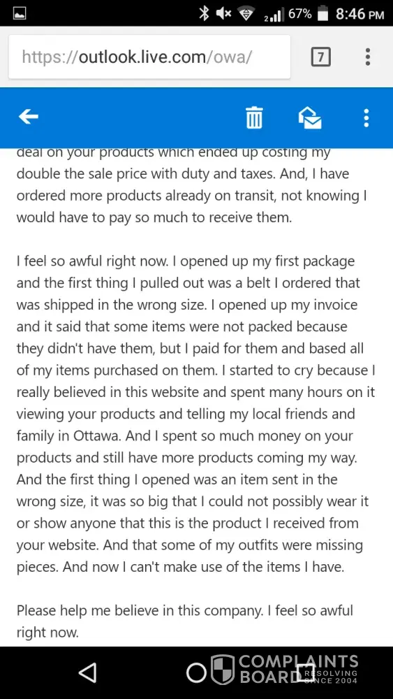 I received the wrong sized product and wrote them immediately. I went online and noticed they still had my product I bought in the size I asked for! I was expecting them to actually check my email so that they could send me what I ordered. By now, I'm sure they do not have it anymore. And it's​ their fault. And what am I supposed to do with this wrong product? I can't pay for it to be shipped back. I'm so upset right now.