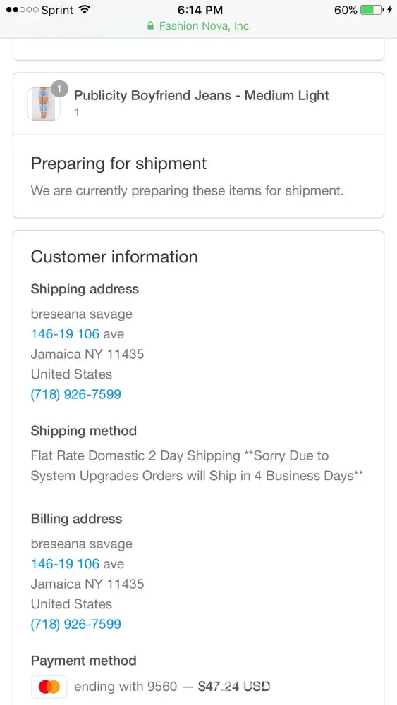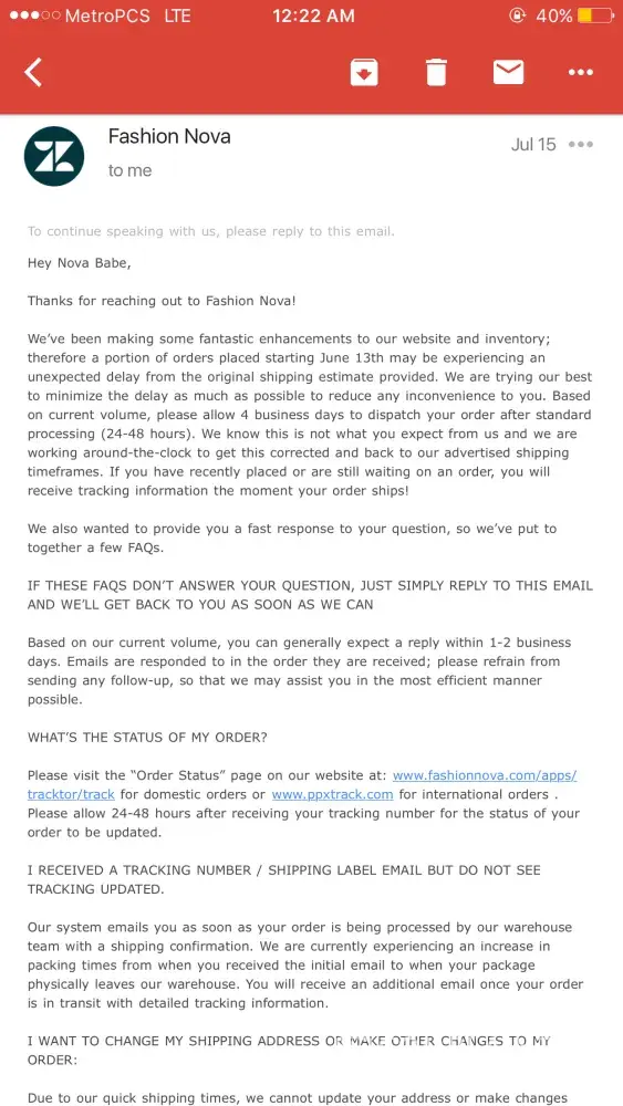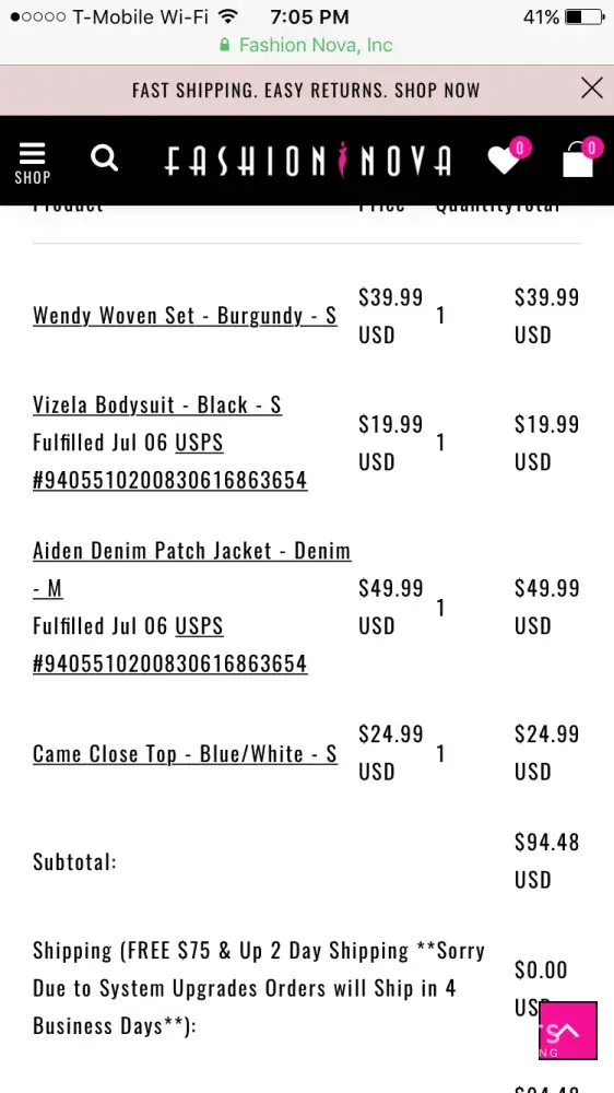 placed three orders through fashion nova one towards the end of june for 80.00$, another on 7/3 for slightly under $300.00, and a third on 7/6 or 7/7 for another 80.00$ or so. I was aware that they were having delays in shipping, however, I have ordered from them many times in the past (All to the same shipping/billing address and all of my same contact info btw) and as I received my june order without issue other than the slight delay in shipping, I was confident in placing additional orders. The site indicates orders will be shipped in 4 business days instead of 2, and I understood that the fact that it was a holiday the next day might cause an additional delay.