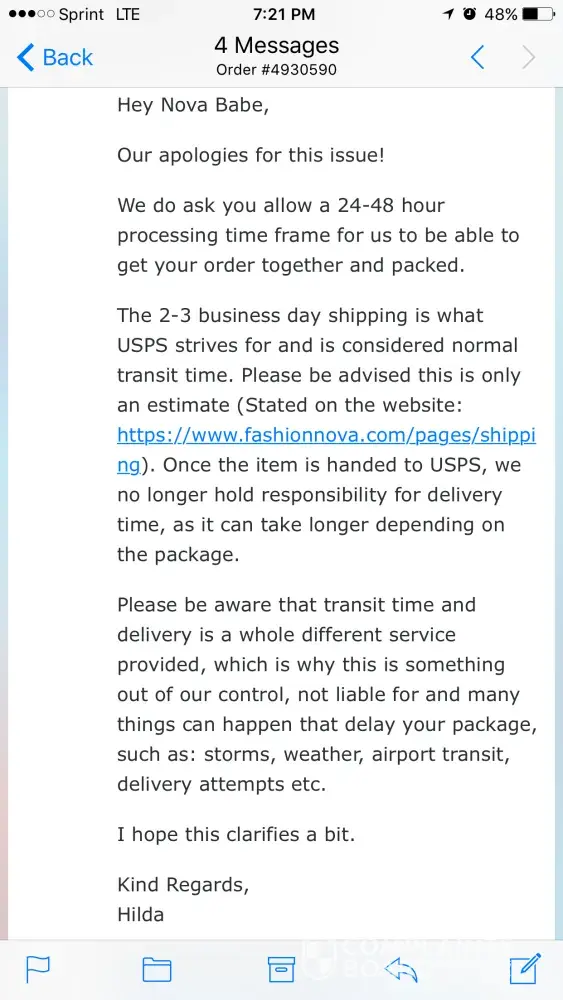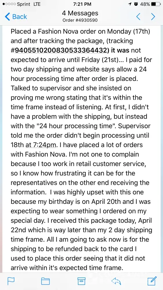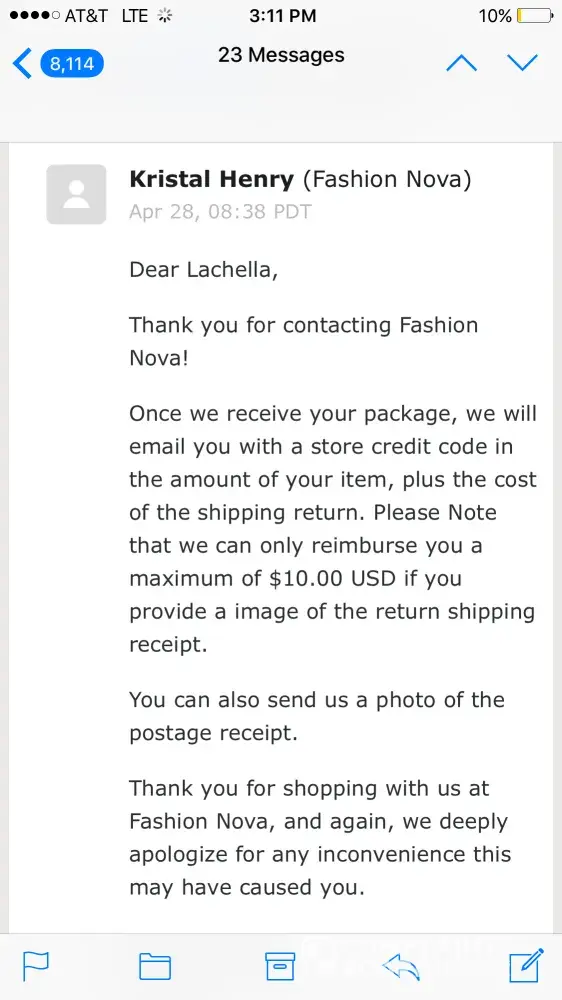 Customer Service is pretty much non existent. Talked to a supervisor on the phone and she talked over me the whole time. Emailed once, no answer. Emailed again, and pretty much got a sorry but we aren't going to do anything about it (attached pictures of correspondence). I placed many orders with Fashion Nova and that was my last order with them. The supervisor really turned me off.