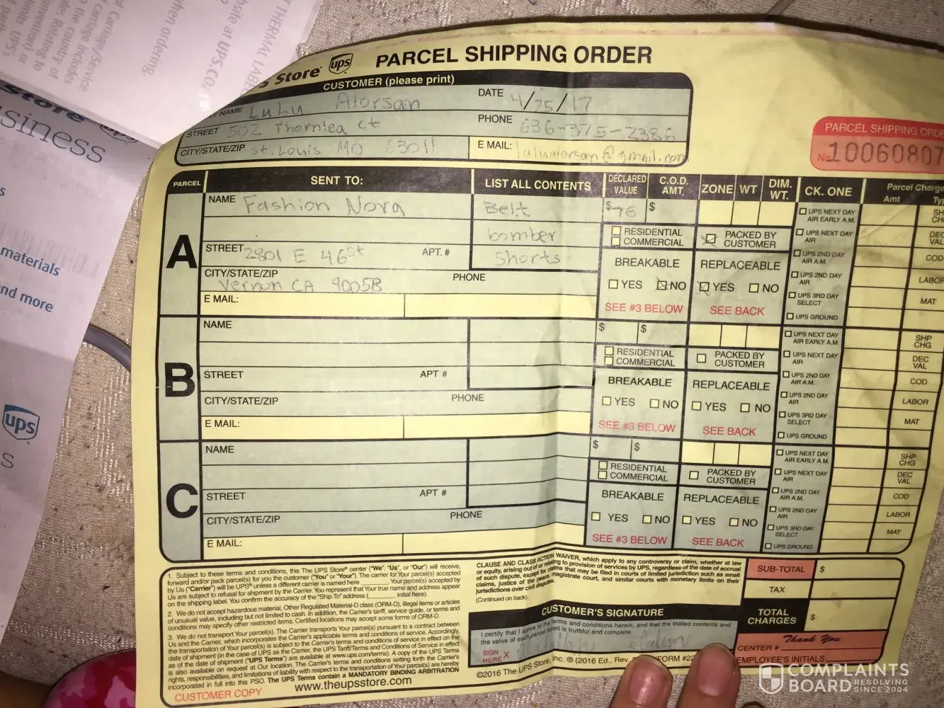 1. Order 4/1/17 And not received. When called fashion Nova claimed order was on hold due to suspected Fraud even though the money was withdrawn from bank account and bank did not complain of any fraud.