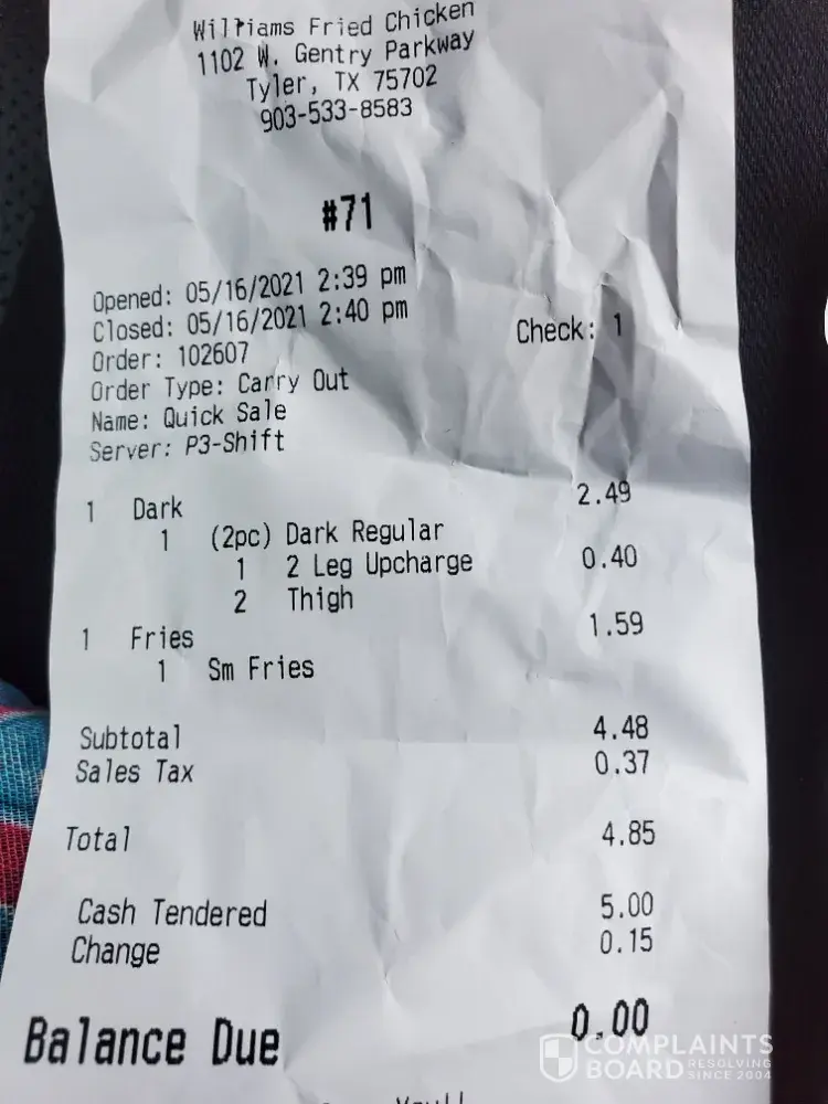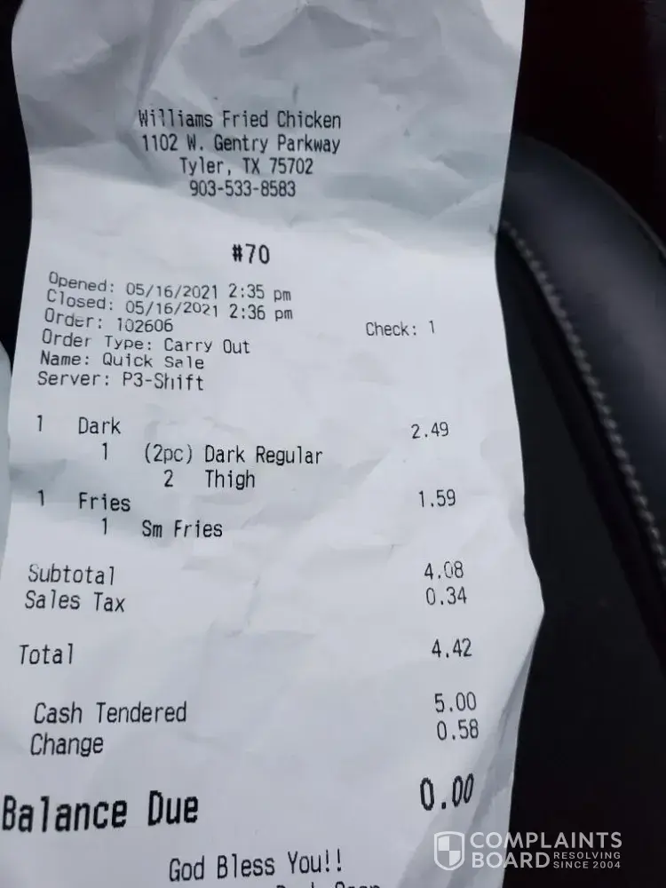 Read full complaintWilliams Fried Chicken - Incorrect order, overcooked chicken, and nasty attitude of the "so-call" manager that refused to give me her name.