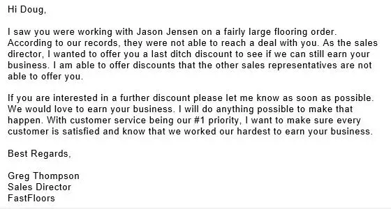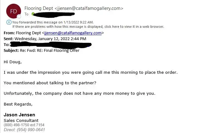I requested a quote online from fastfloors.com and received a call back from a salesman. We discussed a price and I told him I would give him an answer in the morning. The next morning I received an email from the Sales Director (see attached) saying he could give me a better deal. I responded asking what he could do and I got a message back from the original sales guy saying: