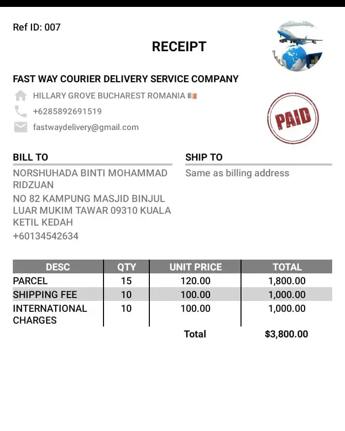 INTERNATIONAL DELIVERY (INVOICE) FOR YOUR CLAIM