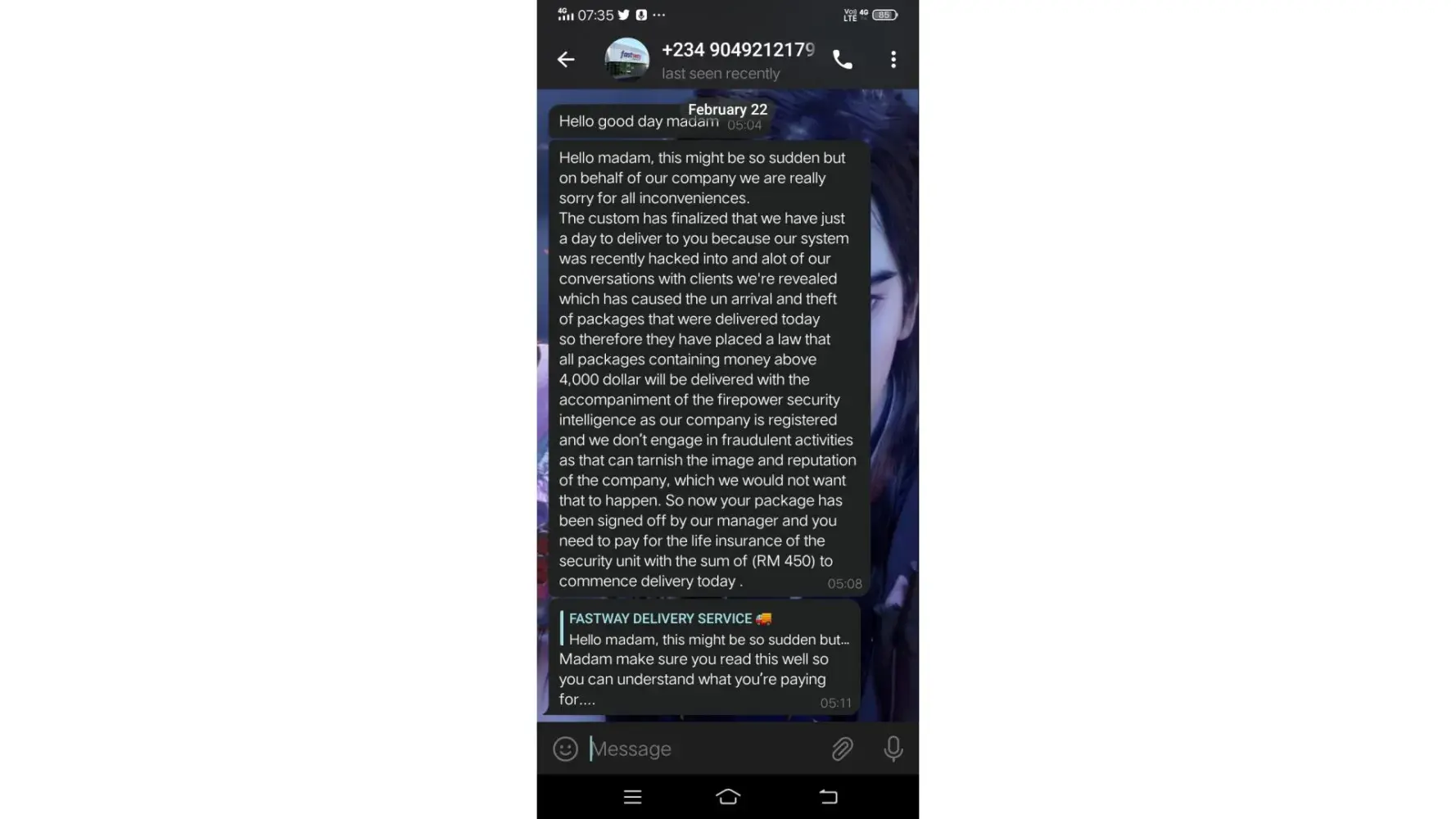 then after two days a man from malaysia called my number telling me my parcel is on hold because it was detected with money and has violated the law