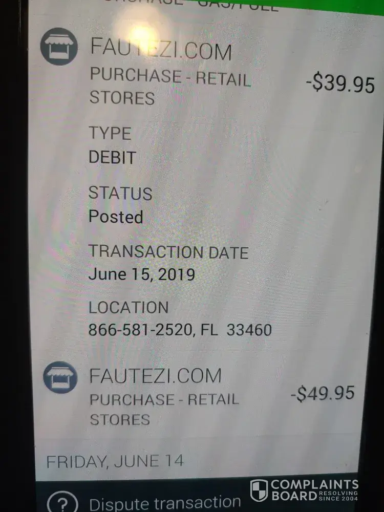 This fautezi.com has charged my card few few times and this is not someone I no and I didn't authorize them to do anything on my account.6/15 39.95, 6/15 49.95, 6/1 29.95, 5/8 39.95, 5/6 1.95, 5/6 49.95.there are 3 or 4 more it looks like they may have just changed the name .its taking me a few minutes because I'm resizing all the photos your site won't let me send above x amount