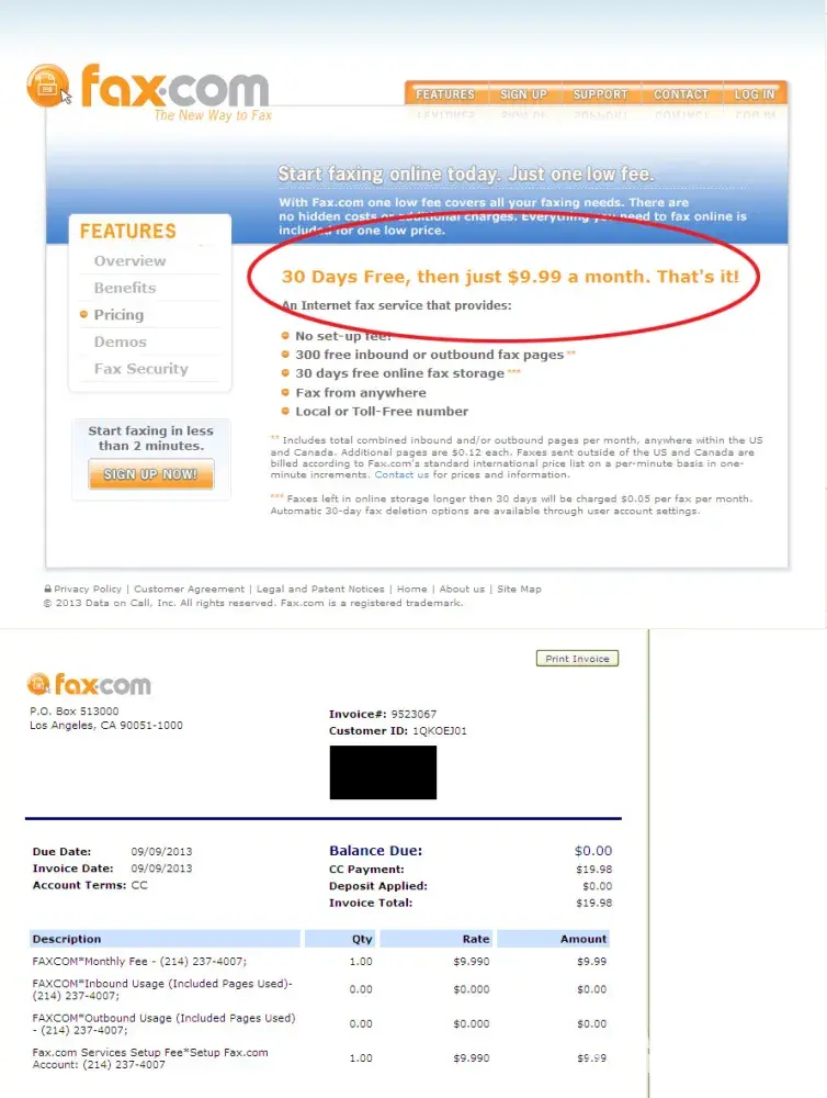 FAX.COM (j2 Global Communications, Inc) advertised "30 Days Free, then just $9.99 a month, That's it!" on their web site. They require a credit card because they say it will be charged if I do not cancel before the 30 days! This is from the confirmation email they sent me...